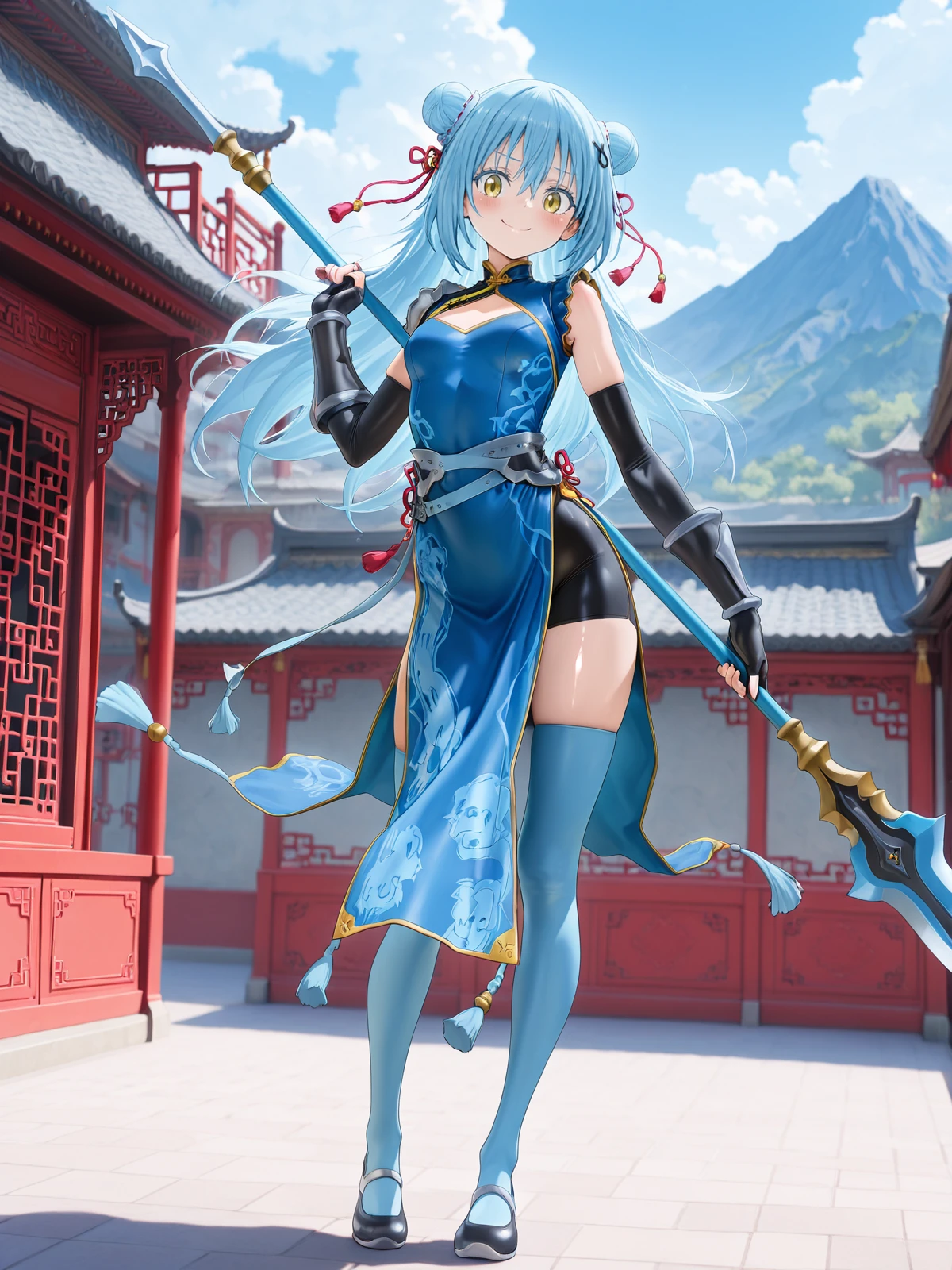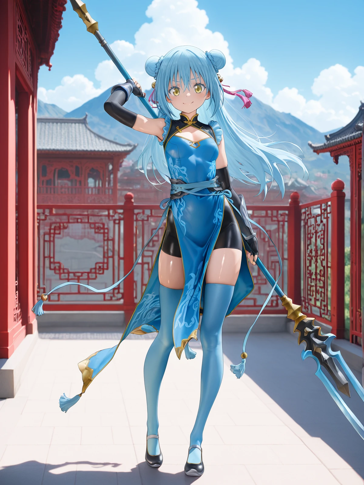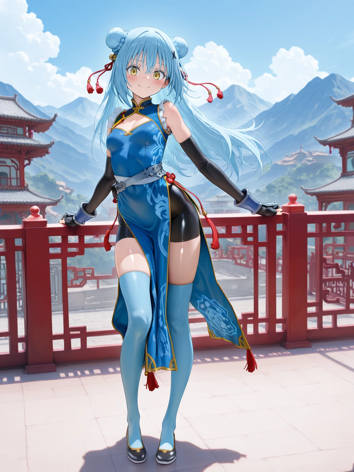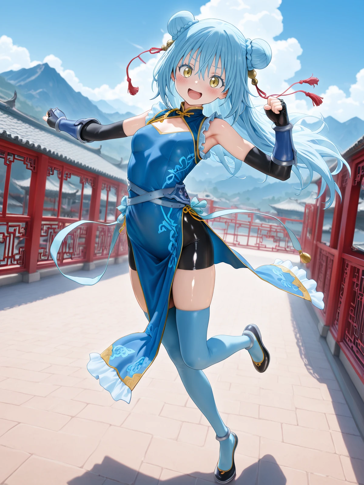 (masterpiece, best quality),ray tracing,absurdres,HDR,1girl,long hair,light blue hair, rimuru tempest, yellow eyes,large breasts, china dress, ribbon, sleeveless, closed mouth, hair between eyes, double bun, chinese clothes, dress, sleeveless dress, blue dress, bangs, , hair bun, shiny hair, hair ribbon, blush, shiny, floating hair, pink ribbon, looking at viewer, standing, sweatdrop, , short dress, straight hair, very long hair, purple ribbon, solo, , legs, ,barefoot, smile, <lora:rimuru hagun:0.7>