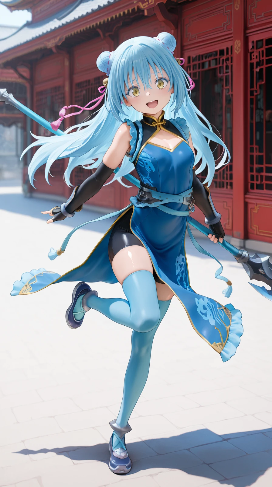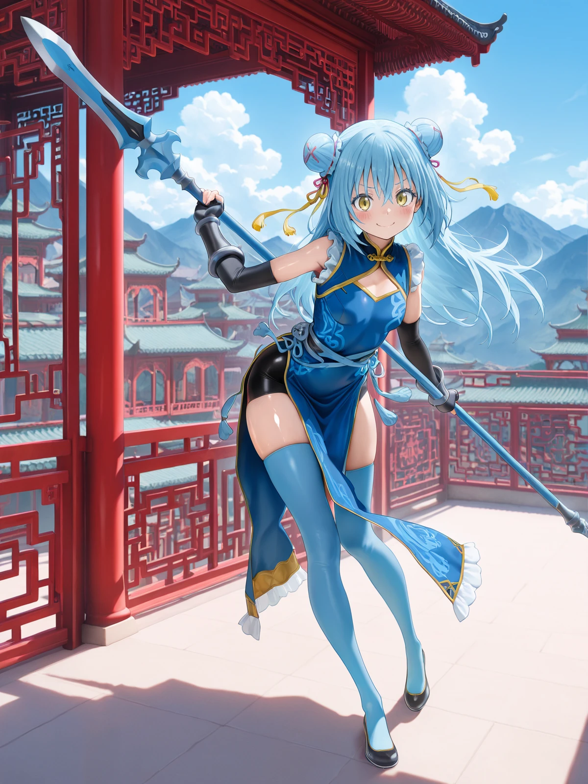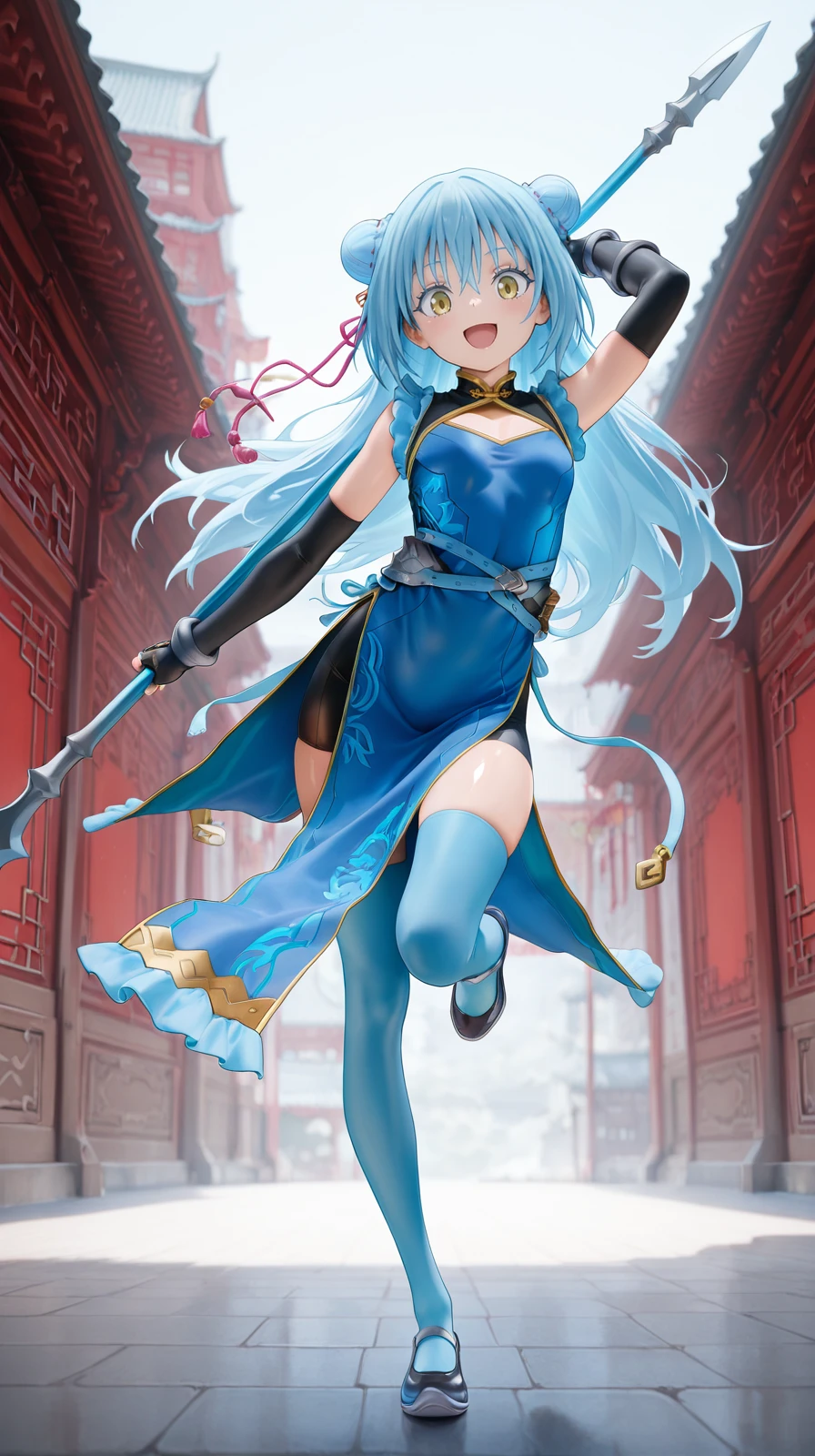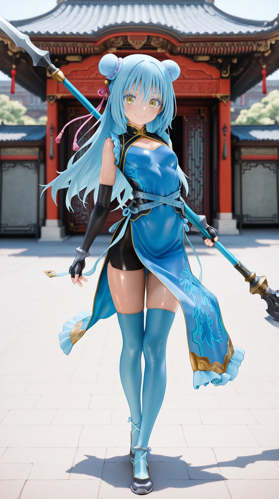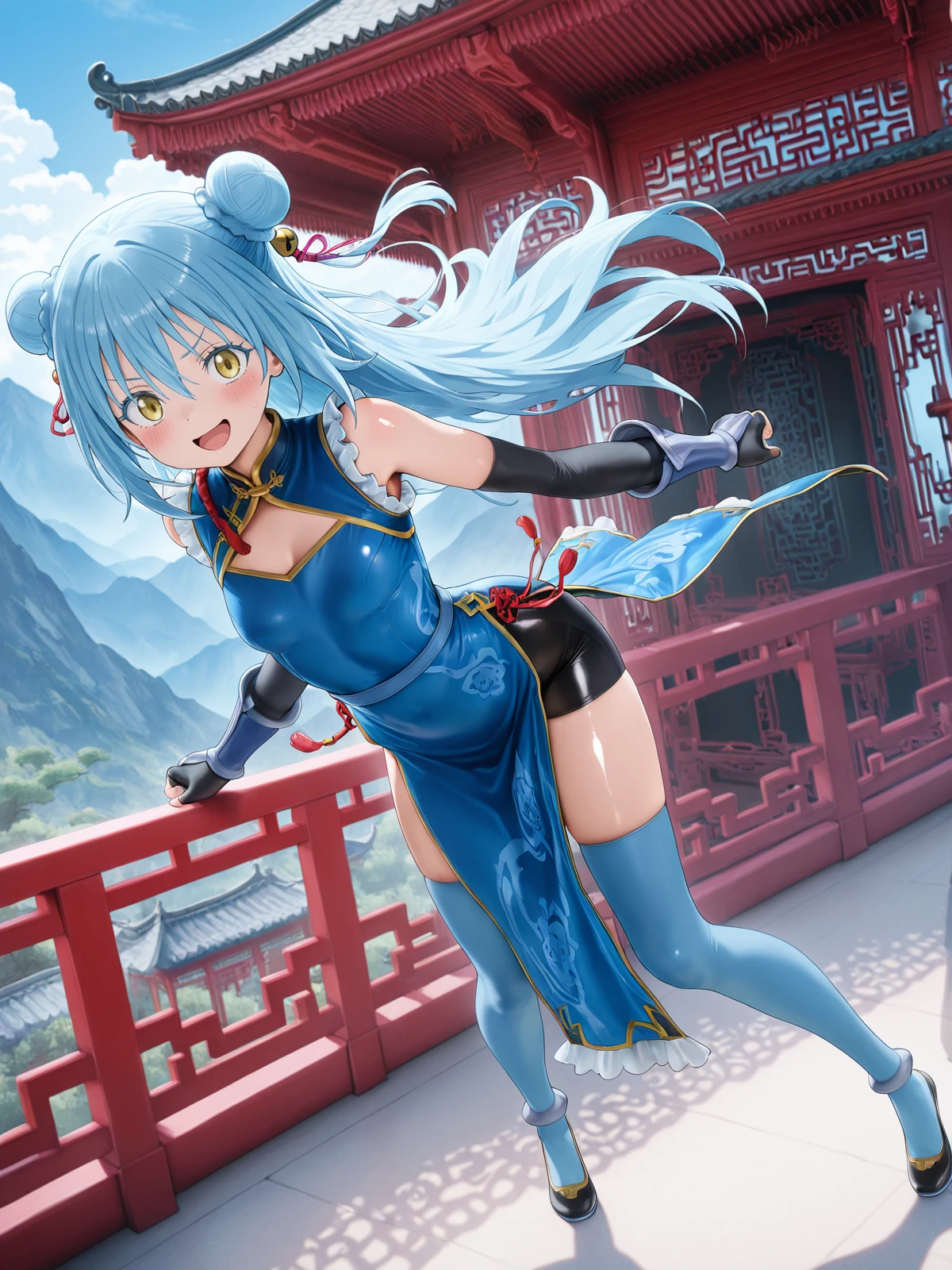 (masterpiece, best quality),ray tracing,absurdres,HDR,1girl,long hair,light blue hair, rimuru tempest, yellow eyes,large breasts, china dress, ribbon, sleeveless, closed mouth, hair between eyes, double bun, chinese clothes, dress, sleeveless dress, blue dress, bangs, , hair bun, shiny hair, hair ribbon, blush, shiny, floating hair, pink ribbon, looking at viewer, standing, sweatdrop, , short dress, straight hair, very long hair, purple ribbon, solo, , legs, ,barefoot, smile, <lora:rimuru hagun:0.7>