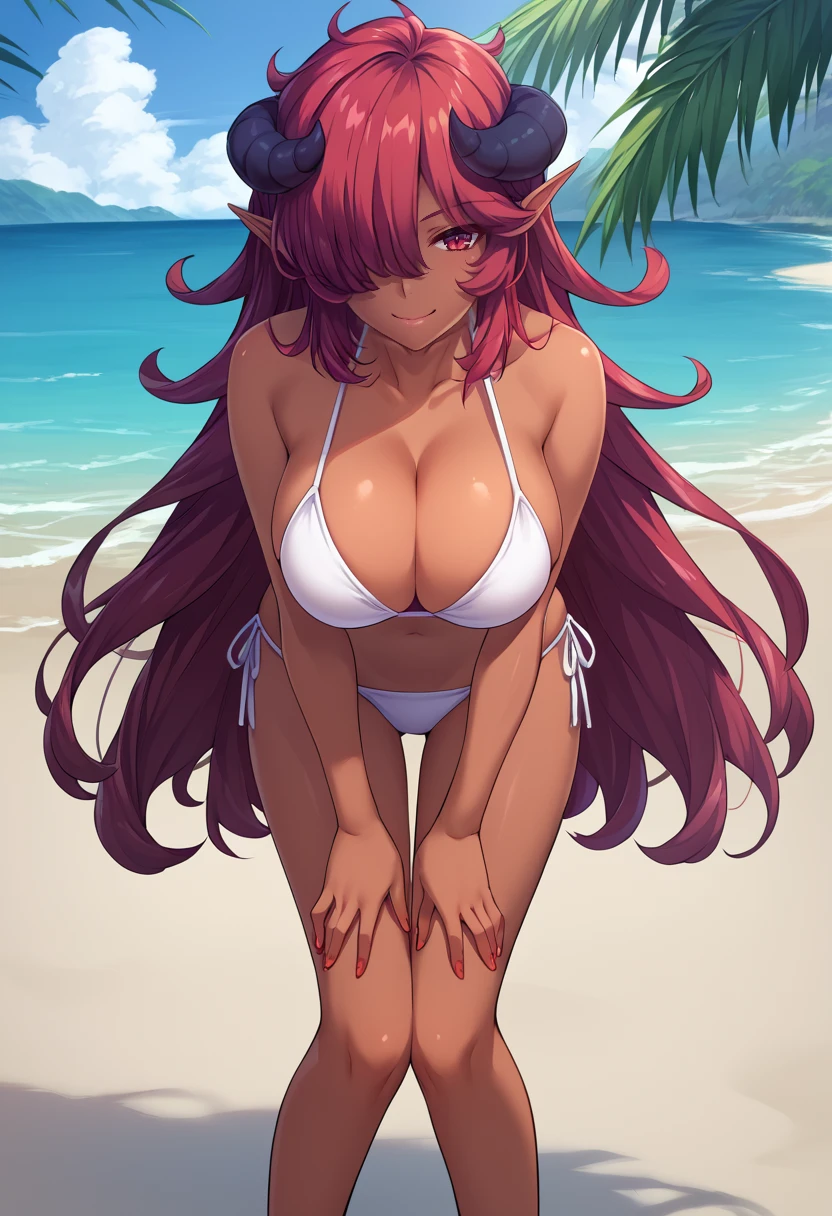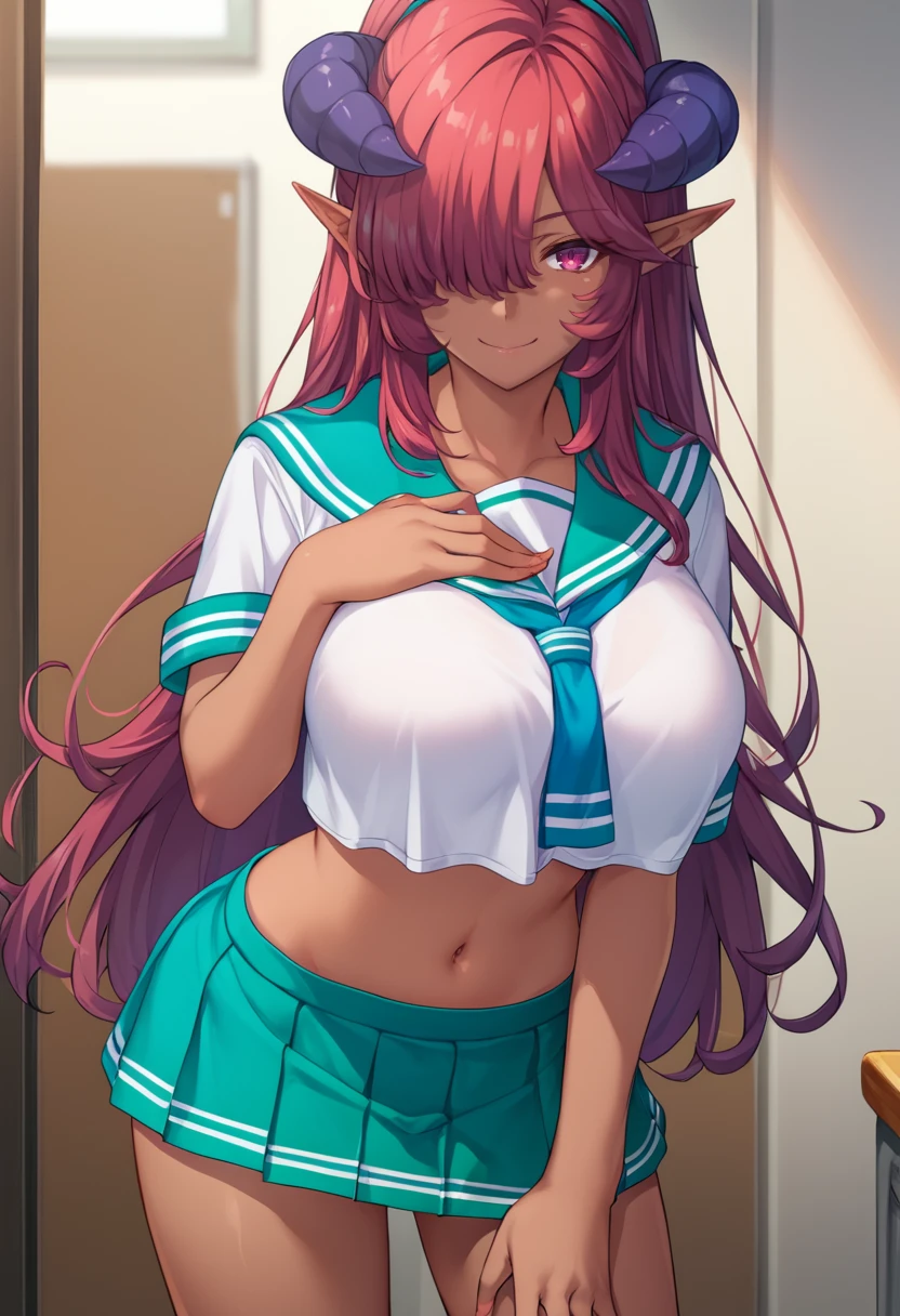 seira senga, dark skin, red hair, hair over one eye, demon horns, pointy ears, red eyes, large breasts