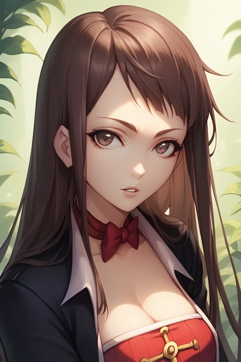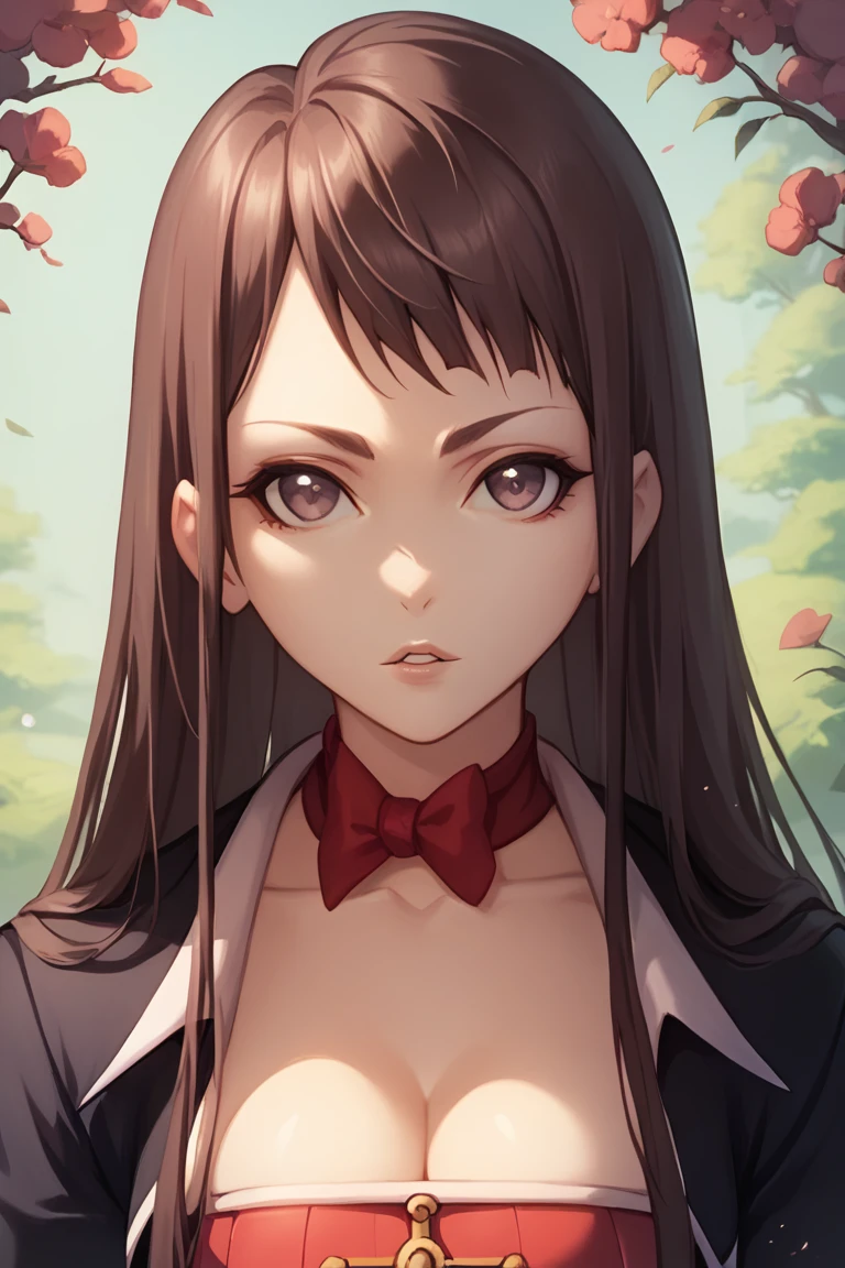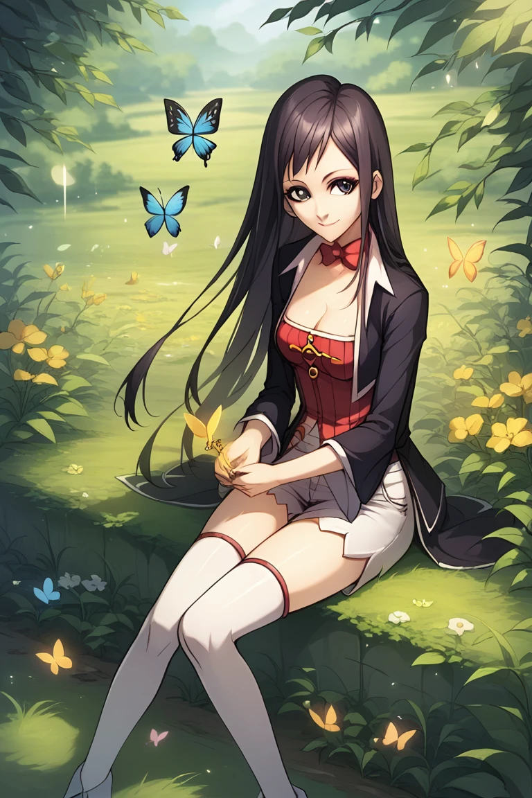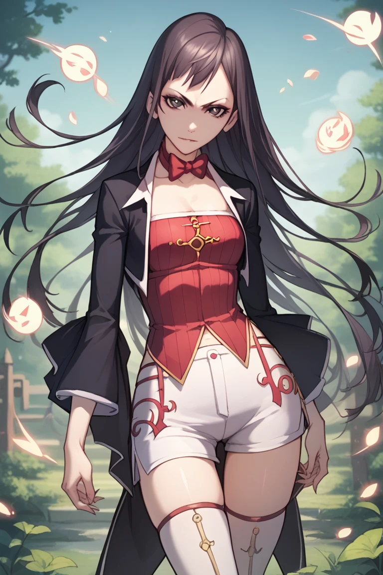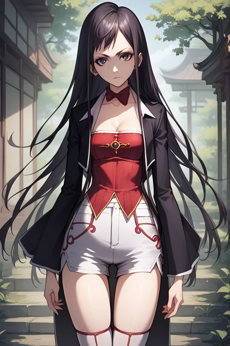 (black blazer:1.2), red bow tie, (red blouse),( cleavage:1.2), white shorts with red trim, a black blazer, and white knee-high socks.