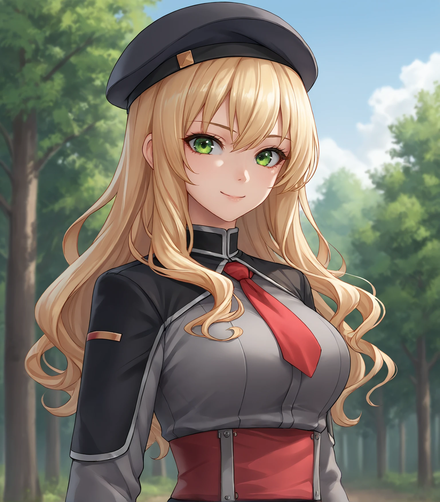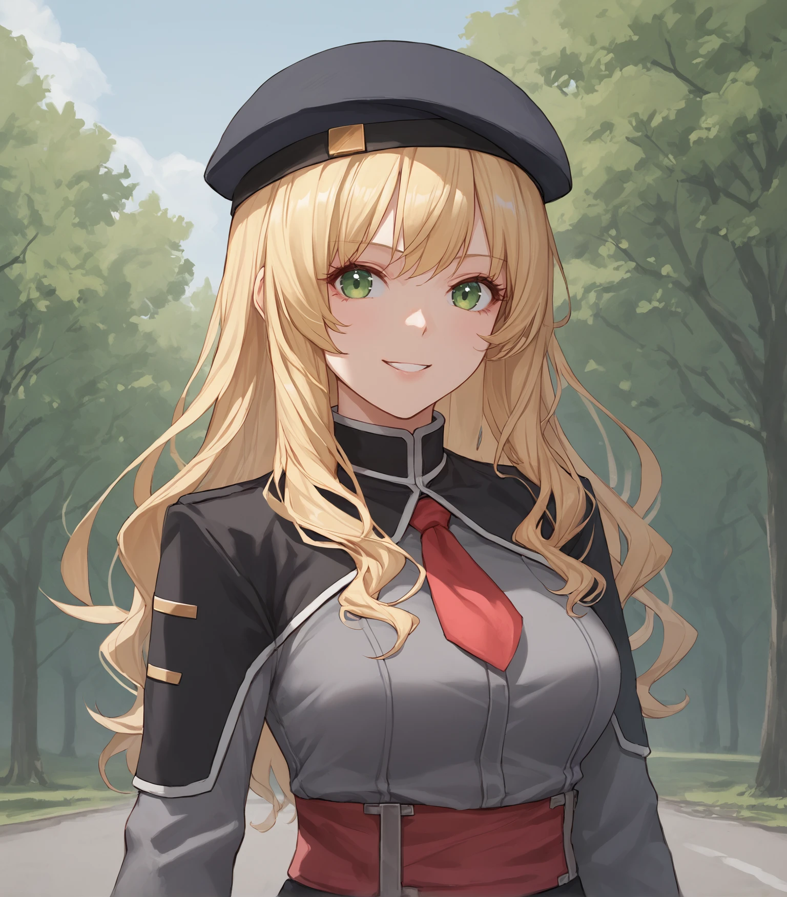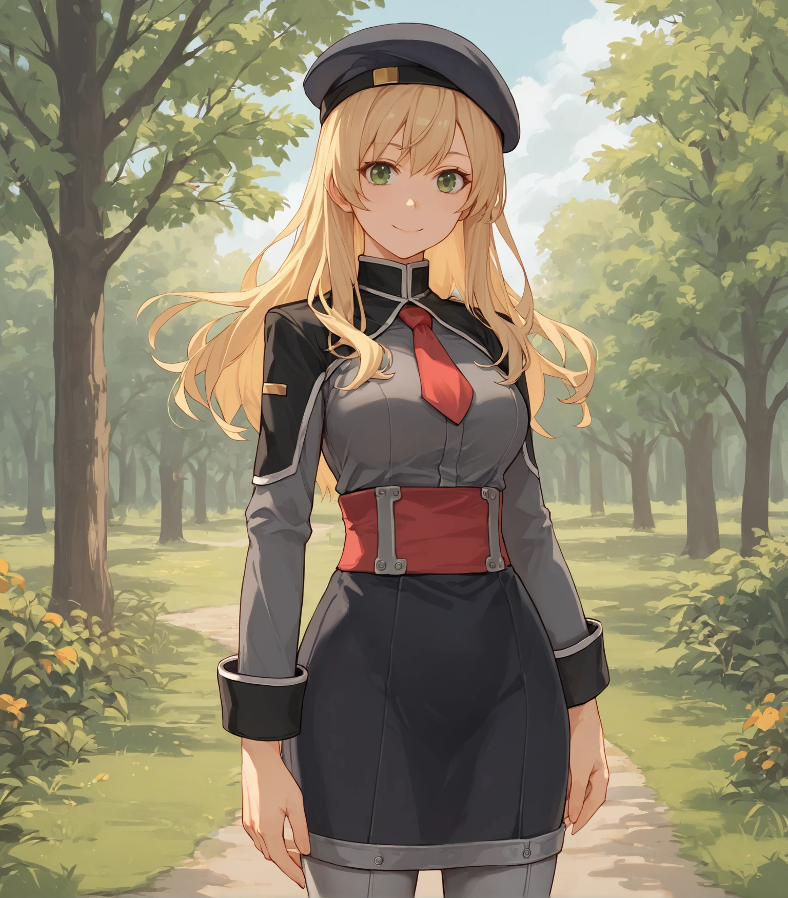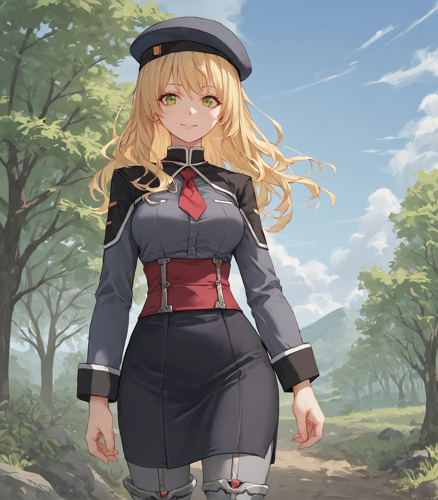 <lora:Mireille:0.9>, Mireille, blonde hair, long hair, green eyes, medium breasts, military uniform, black beret, grey shirt, black skirt, grey leggings, boots, red sash, red necktieThis is an individual character upload from the main character pack for use with the Civitai generator service.