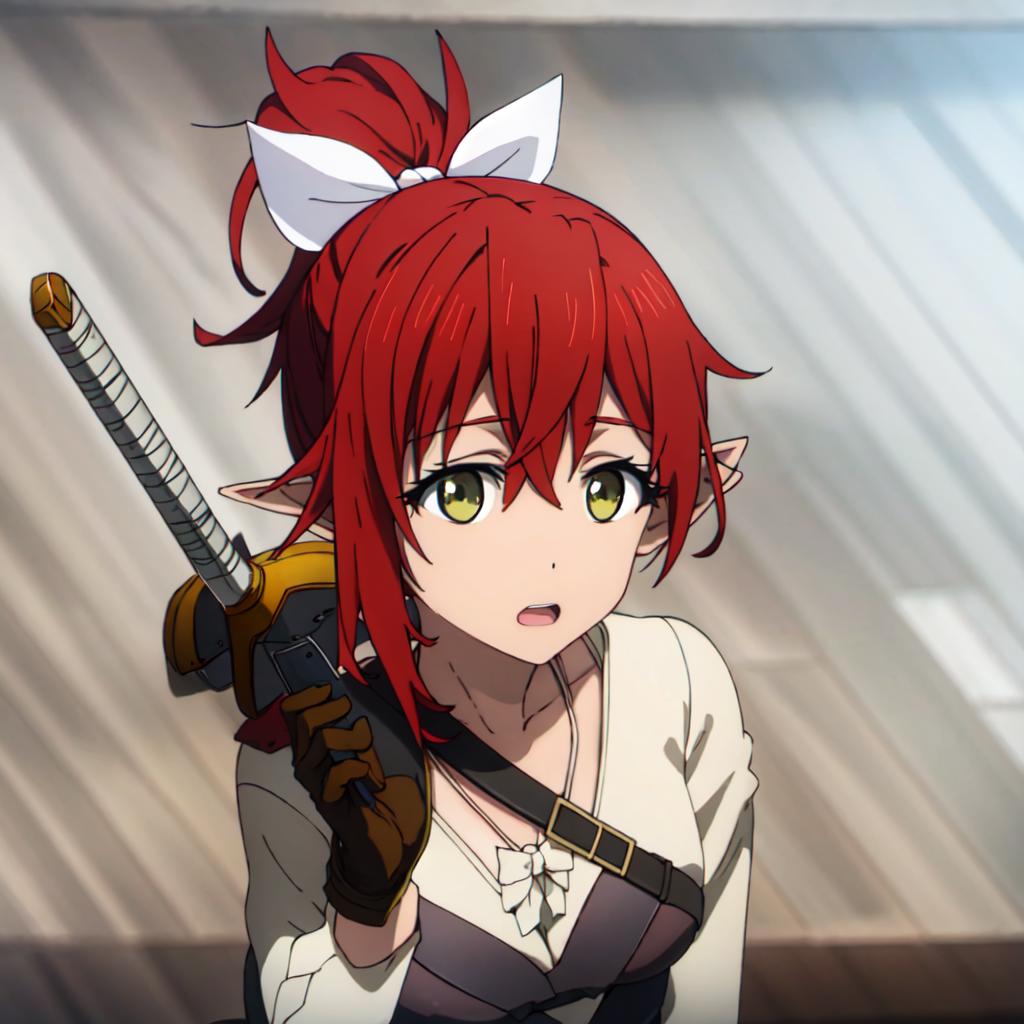 Outfit: pantyhose, shorts, sword, armor, gloves, ribbon