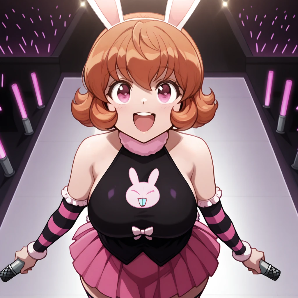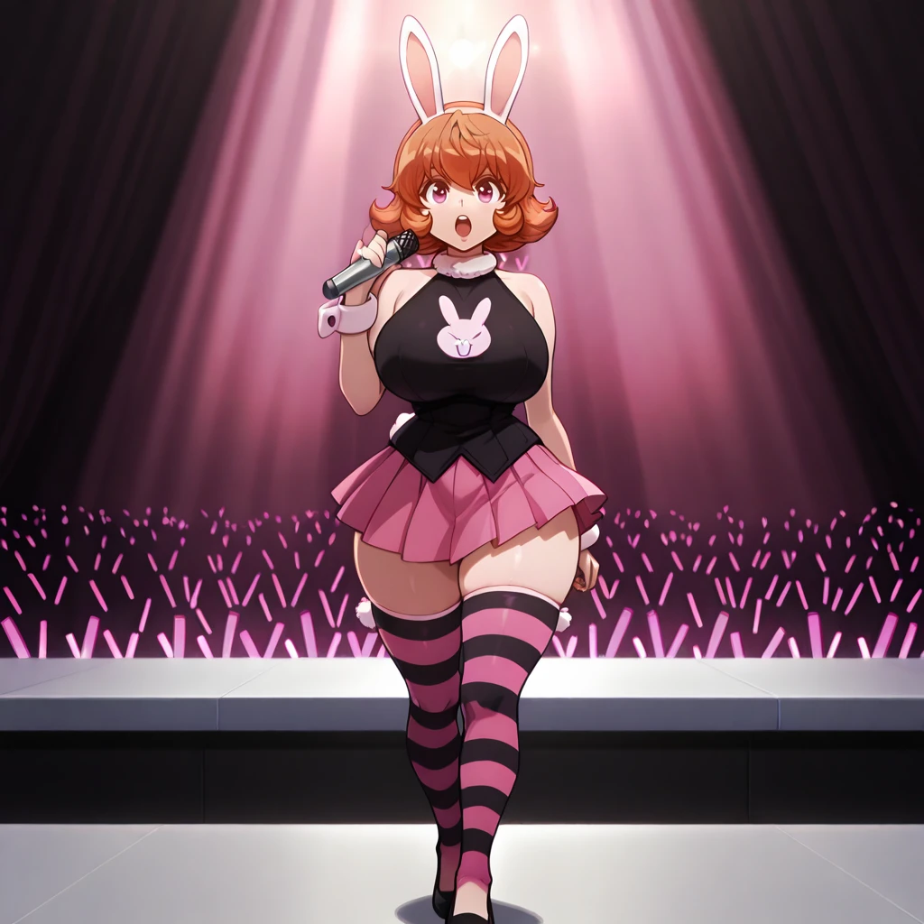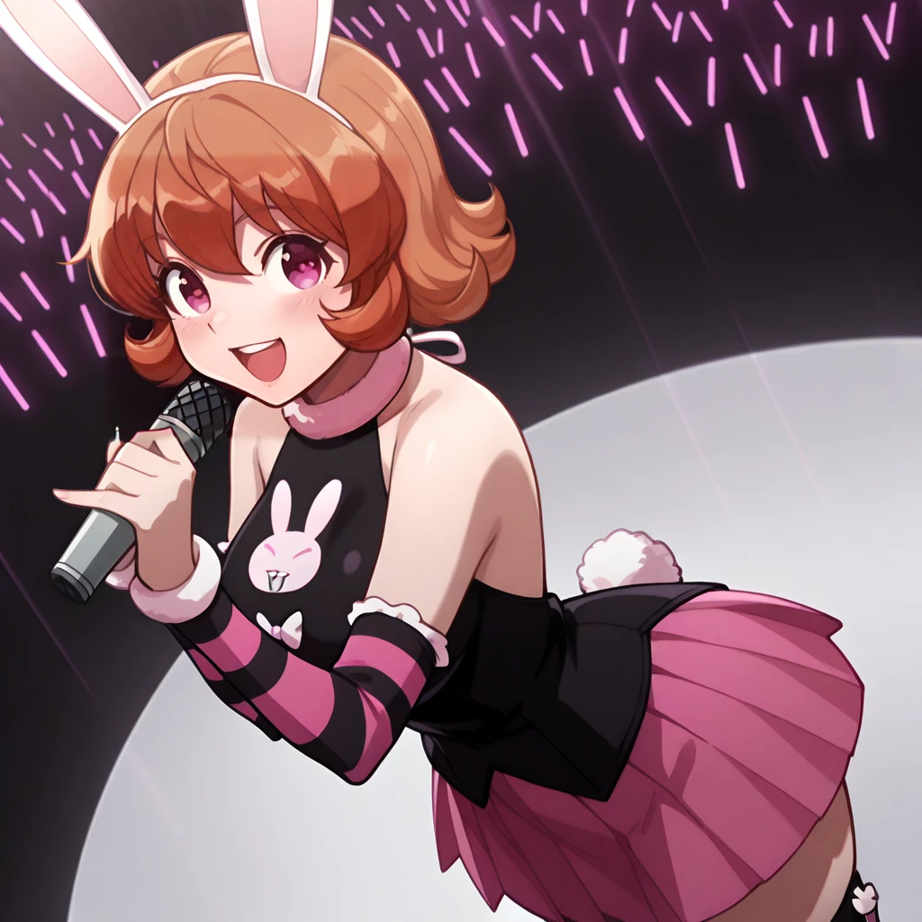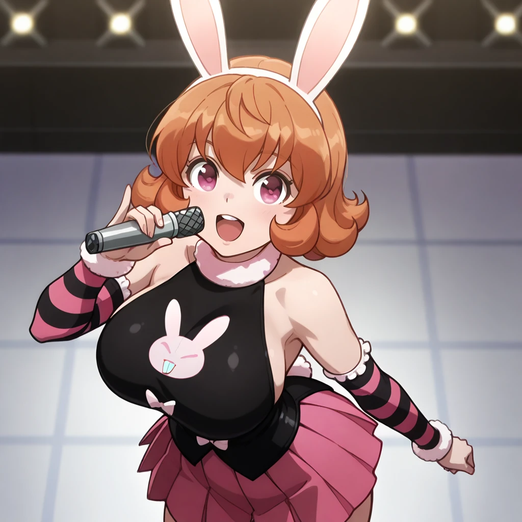 TAGS: orange hair, short hair, pink eyes, animal ears, rabbit ears, animal tail, rabbit tail, black top, halterneck, sleeveless, ????? logo, pink bow, pink skirt, pleated skirt, striped armwear, armwarmers, pink cuffs, striped legwear, thighhighs, black shoes, flats, bows, frillsDescription
