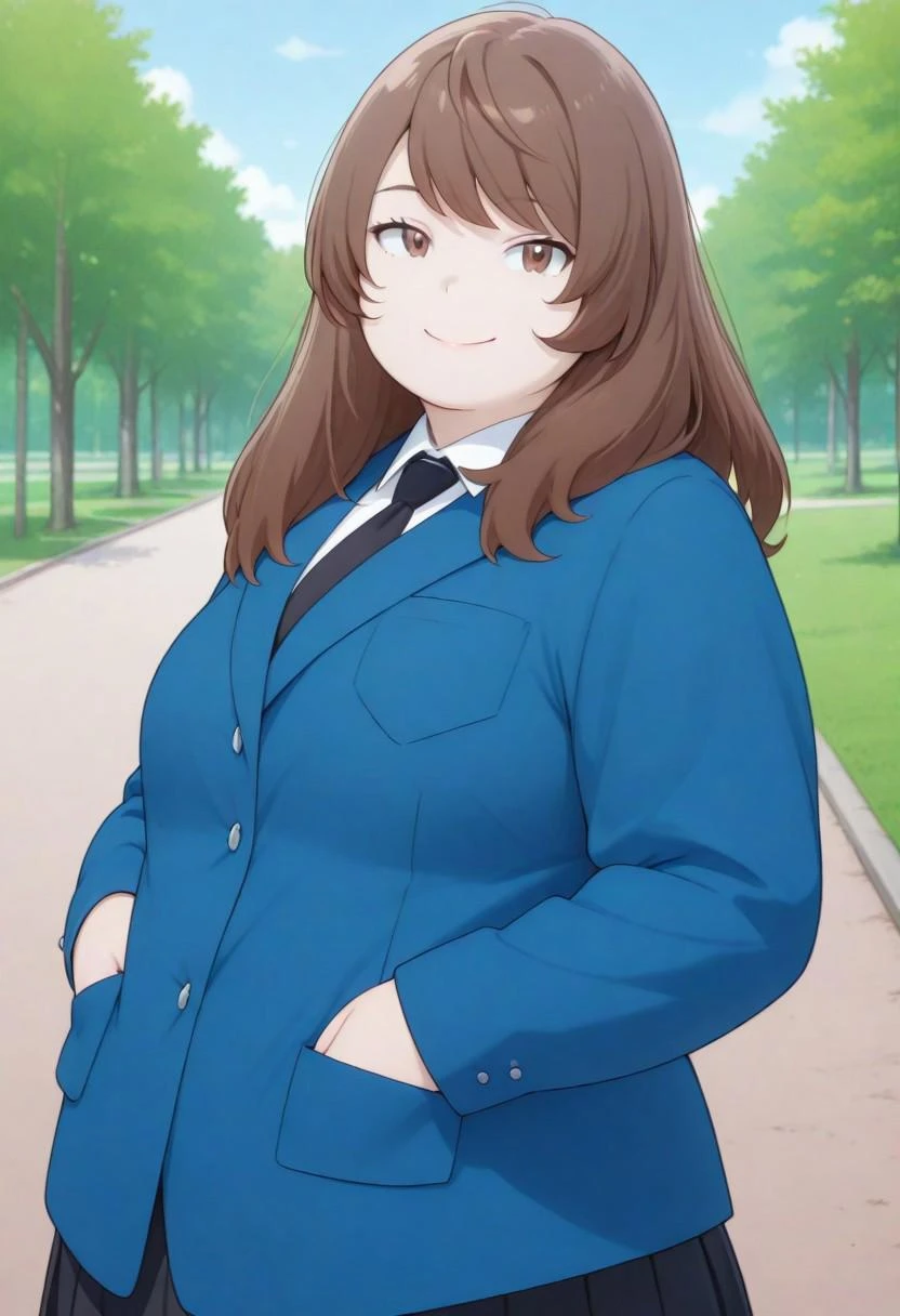 original outfit, blue blazer, long sleeves, school uniform, inner white shirt, collared, black necktie, black skirt, black socks, dark loafers,