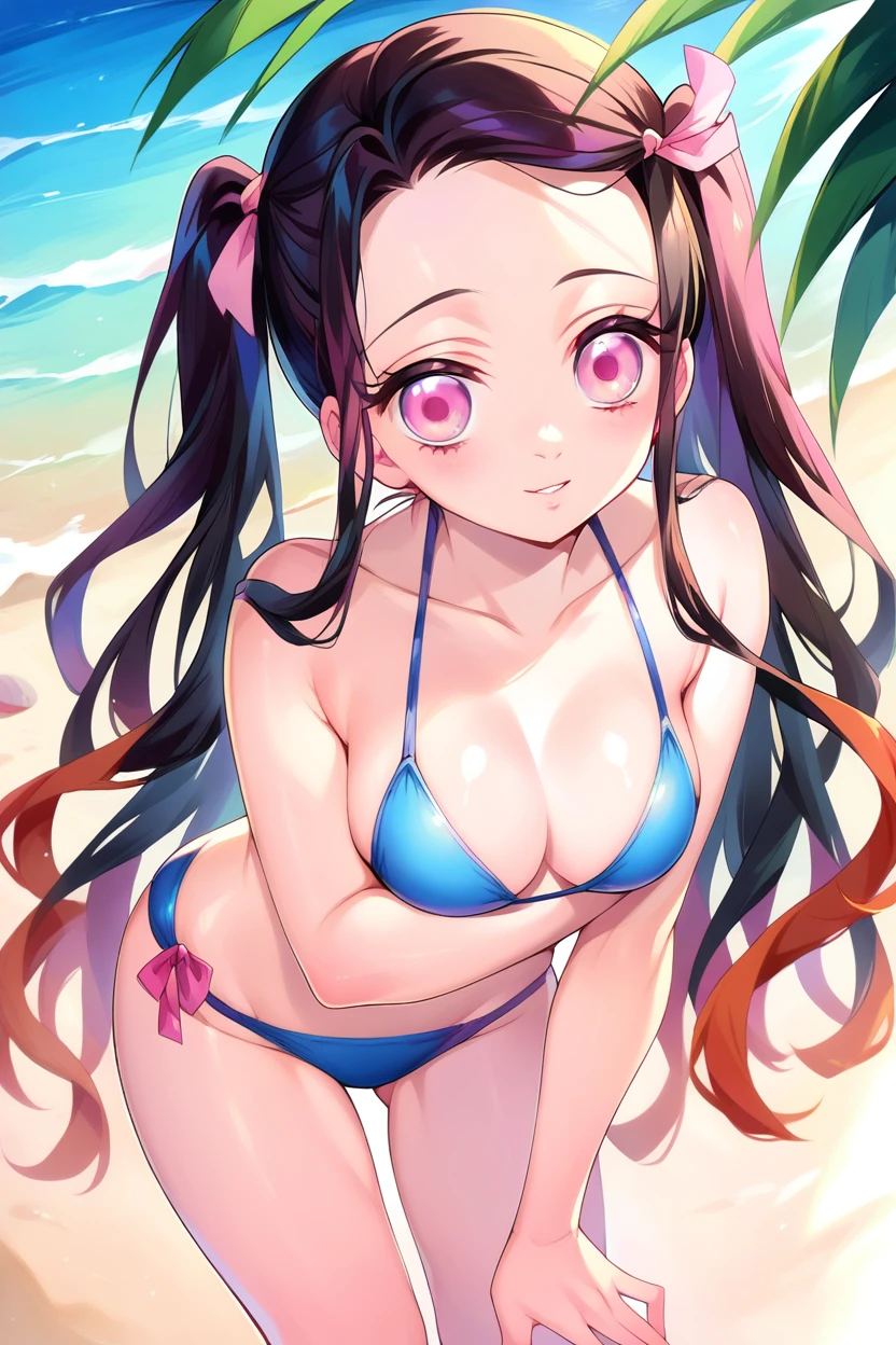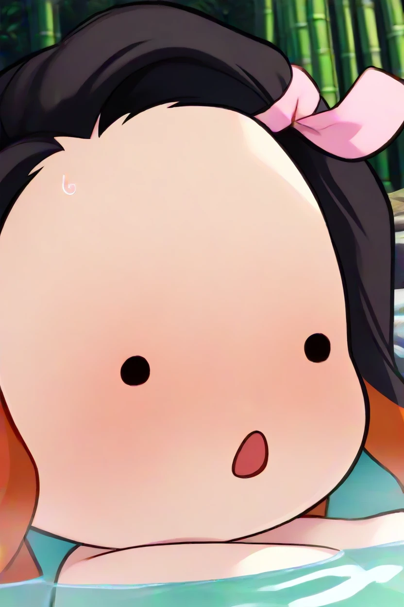 nezukob, black hair, purple eyes,white pupils, pink hair ribbon, two-tone hairChibi Nezuko