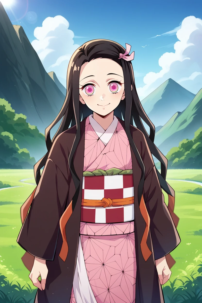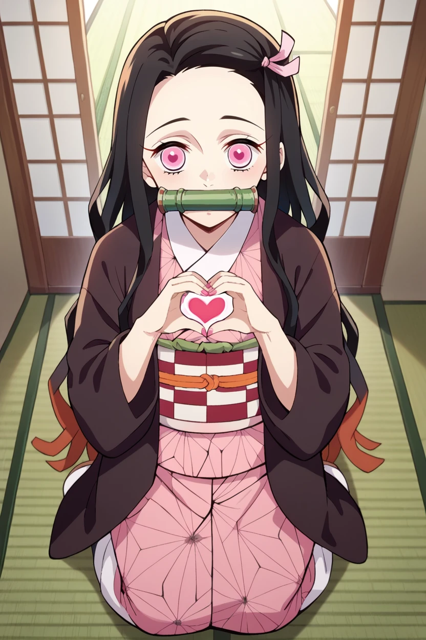 kamado nezuko, black hair, pink eyes,magenta pupils, pink hair ribbon, two-tone hairHuman Nezuko