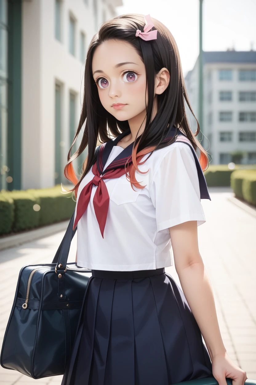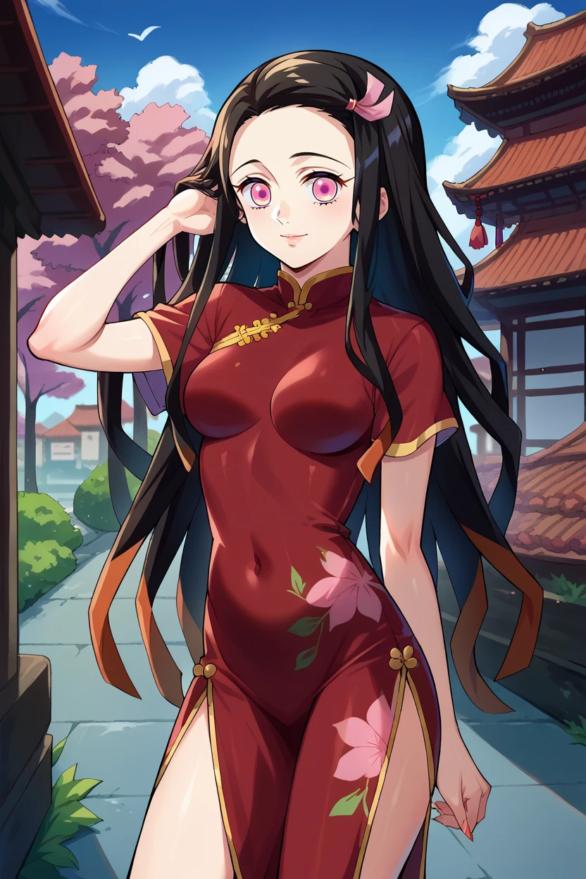 nezukoc, black hair, solid circle eyes, parody, pink hair ribbon, two-tone hairThe outfit is: