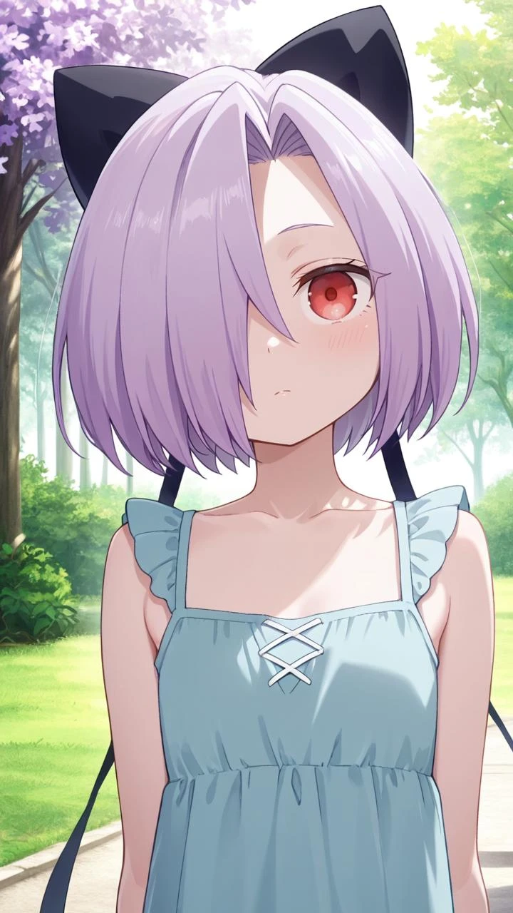 Ciel, red eyes, short hair, lilac hair, hair over one eye, hair intakes, sidelocks, bob cut, big black hair ribbon, flat chest,
