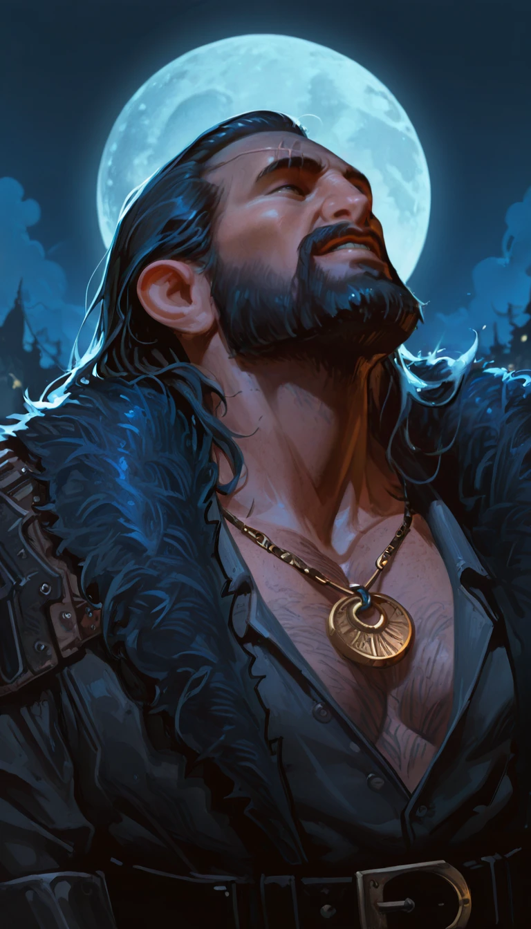 vrrc_vlgrd, beard, facial hair, 1boy, solo, black hair, jewelry, necklace, fur trim, scar across eye, dwarf, clothes,
