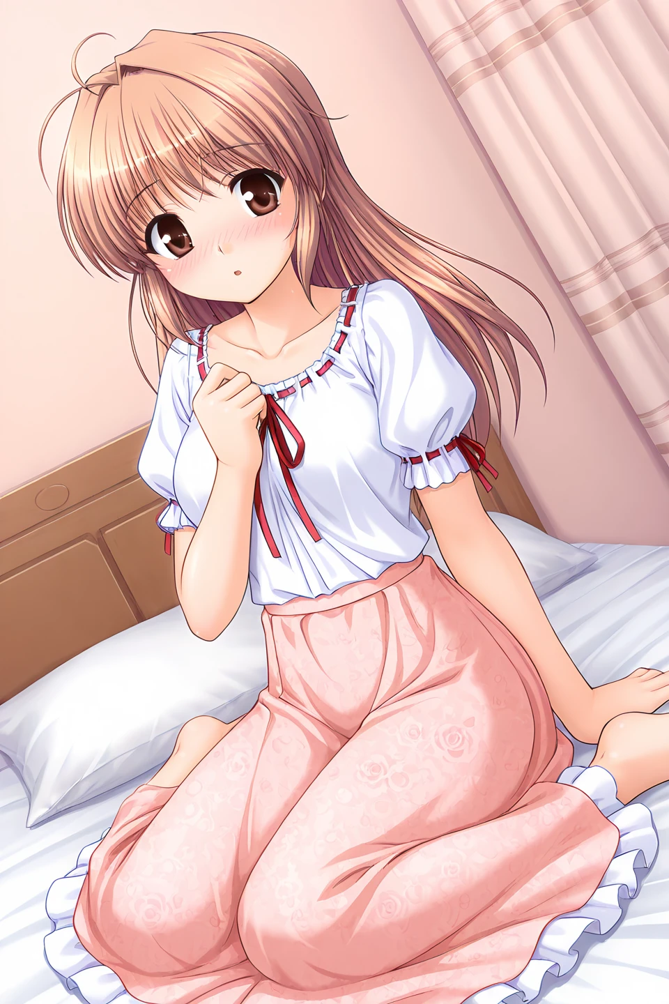 casual,blouse,white shirt,ribbon-trimmed shirt,untucked shirt,short sleeves,puffy short sleeves,ribbon-trimmed sleeves,red ribbon,pink skirt,long skirt,frilled skirt,print skirt,floral print,blush,collarbone,barefoot,
