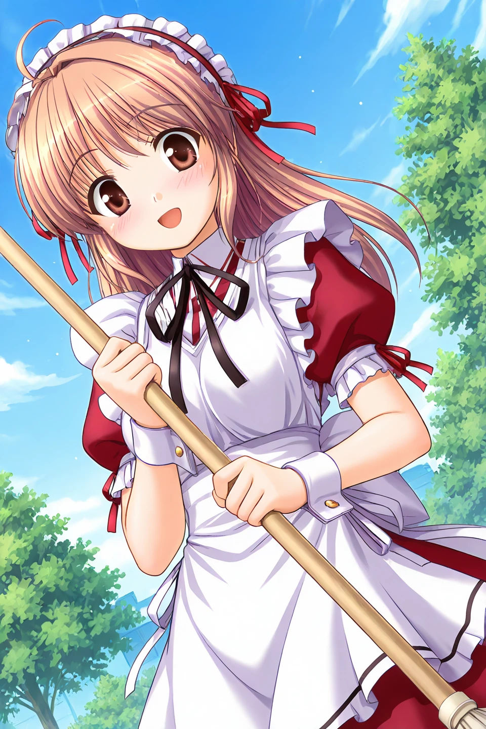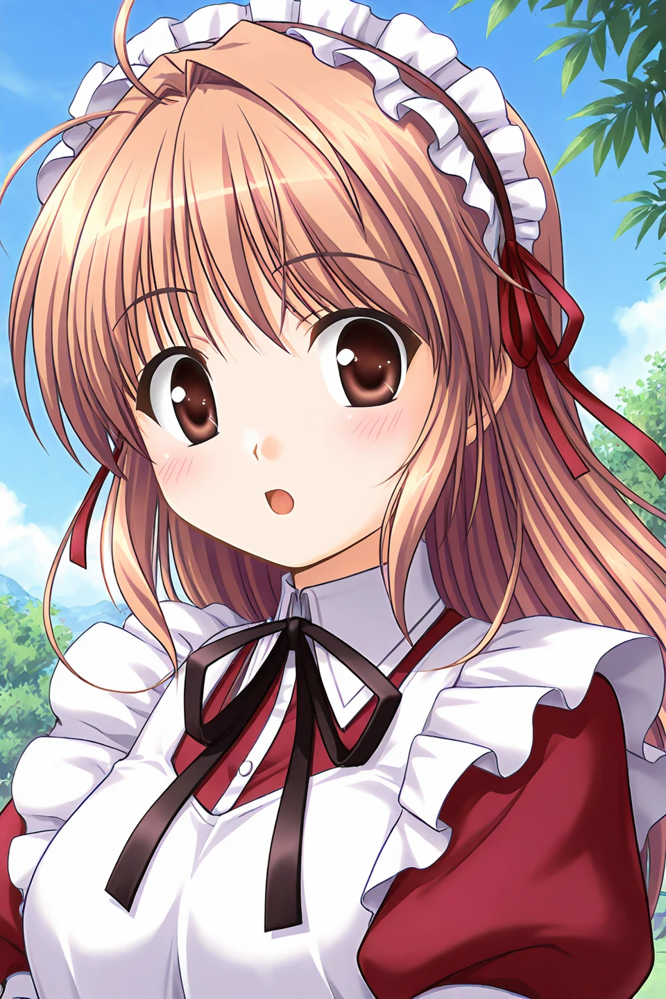 maid,maid headdress,black hairband,frilled hairband,hairband with ribbon,red ribbon,red dress,pinafore dress,collared dress,puffy short sleeves,neck ribbon,arm ribbon,black ribbon,wrist cuffs,maid apron,white apron,frilled apron,back bow,white bow,