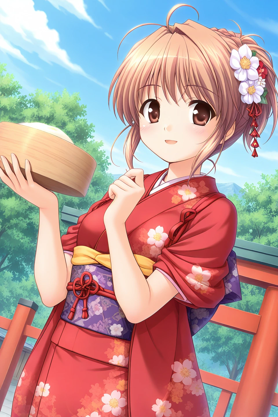 hair up,braid,short hair,short ponytail,hair flower,japanese clothes,red kimono,furisode,floral print,obi,obijime,obiage,sash,sleeves pushed up,tasuki,tying,