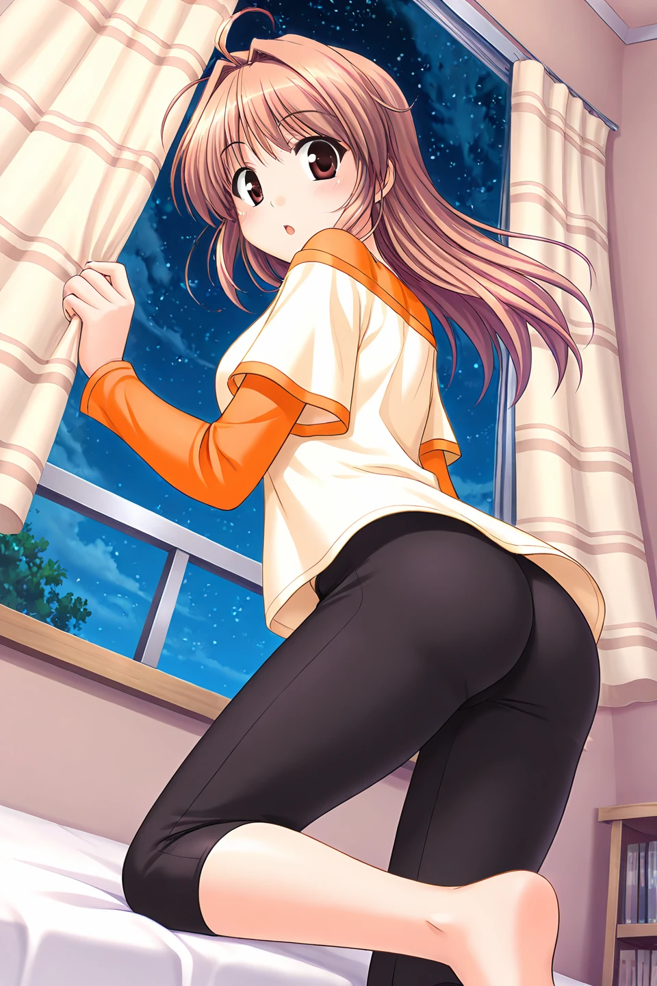 yellow t-shirt,white t-shirt,off-shoulder t-shirt,short sleeves,layered sleeves,short over long sleeves,orange shirt,long sleeves,tight,leggings,bare legs,barefoot,slippers,