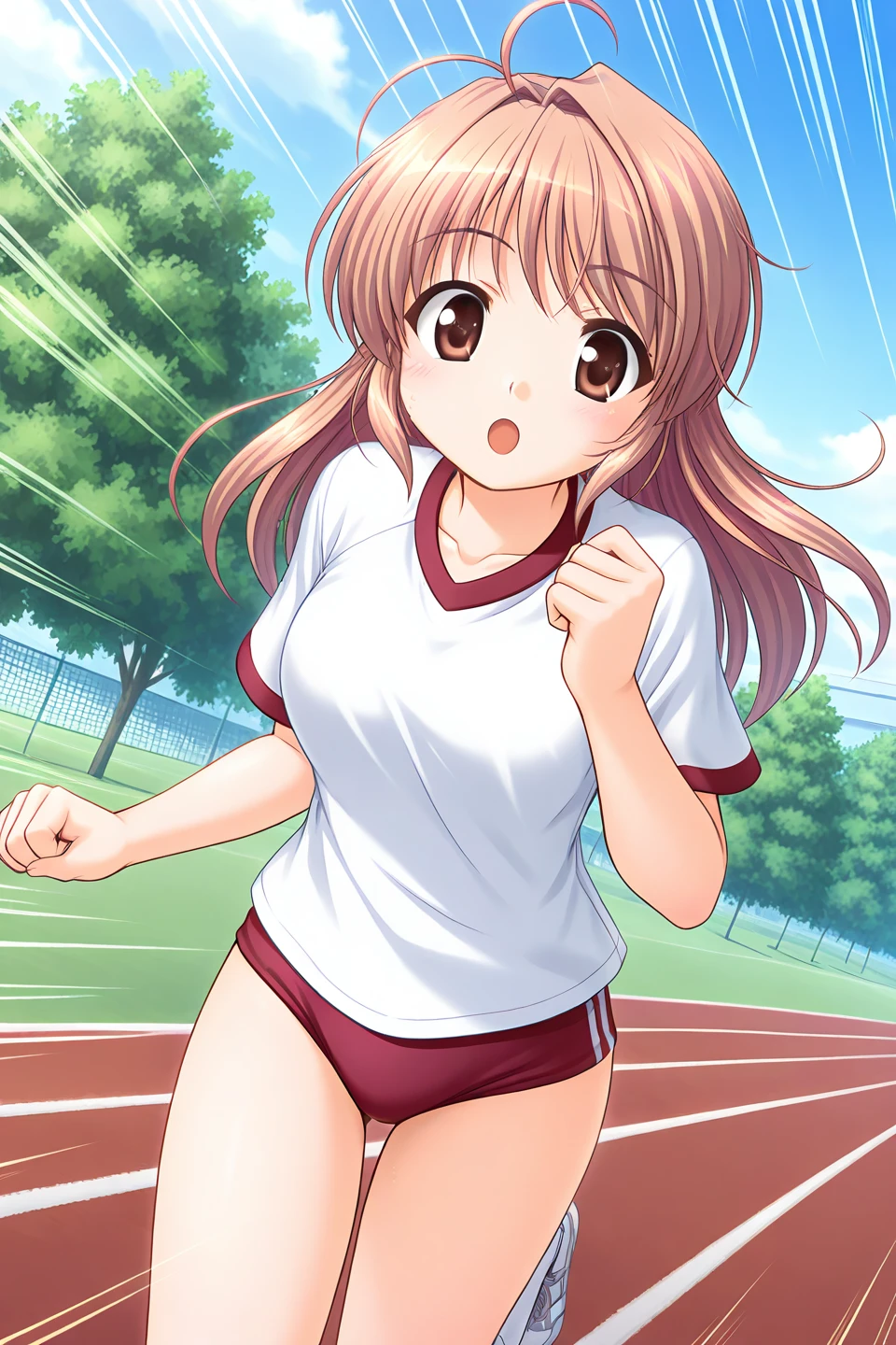 gym uniform,gym shirt,white shirt,short sleeves,red buruma,kneehighs,white socks,sneakers,
