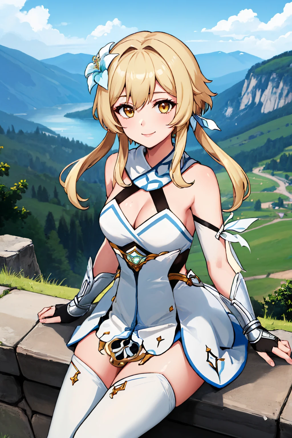 Default Outfit: luminedef, hair flower, white dress, detached sleeves, gloves, white thighhighs, scarf, bare shoulders, cleavage