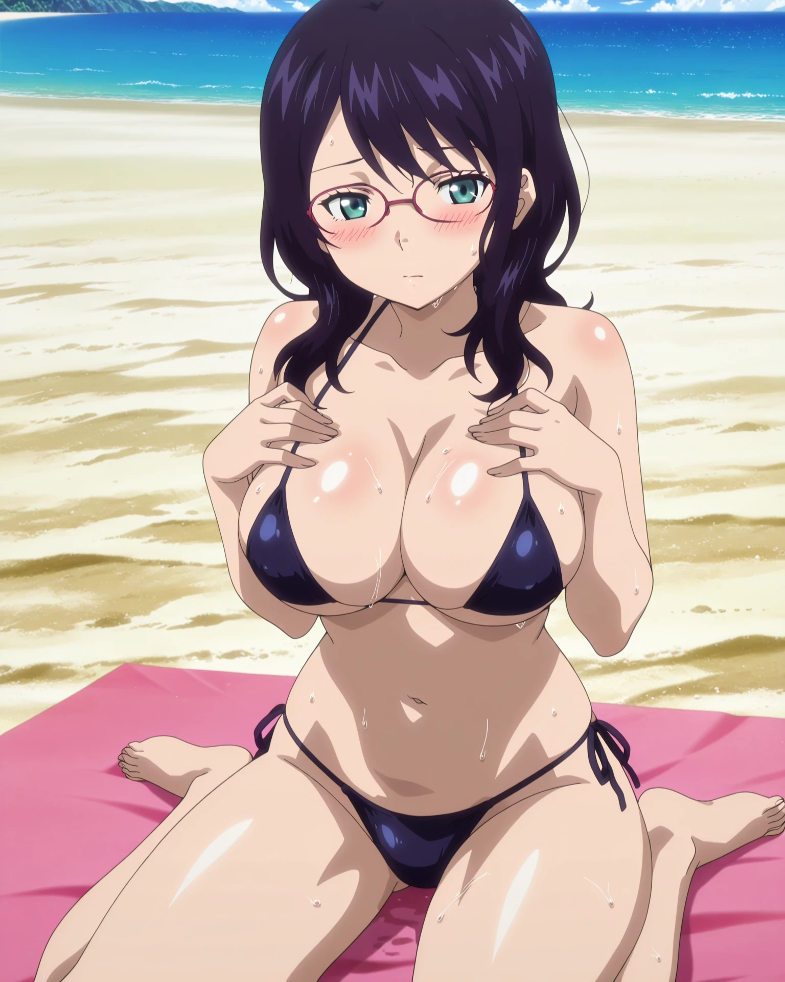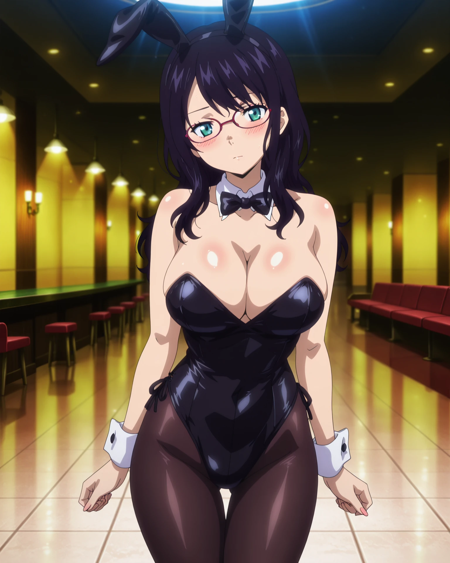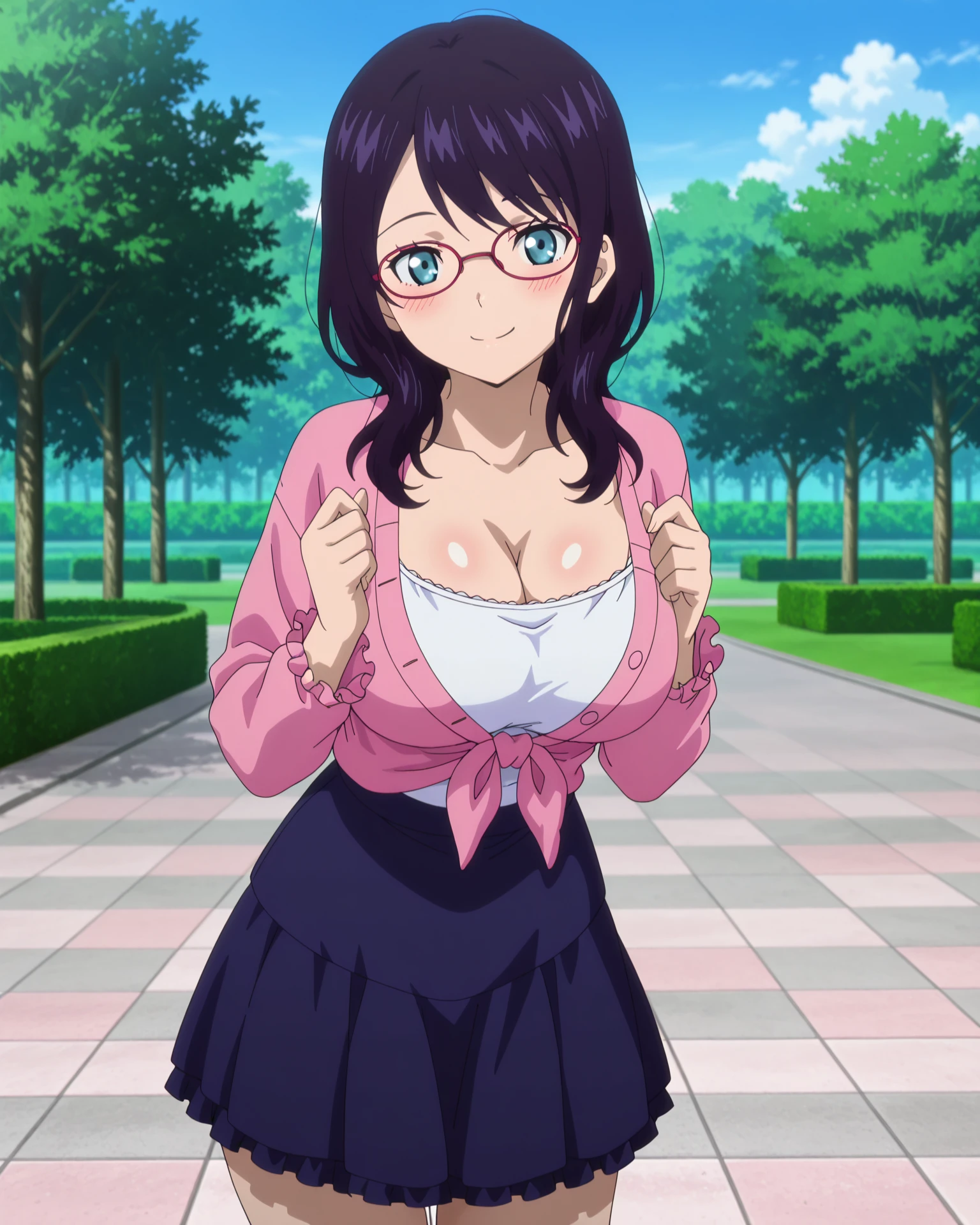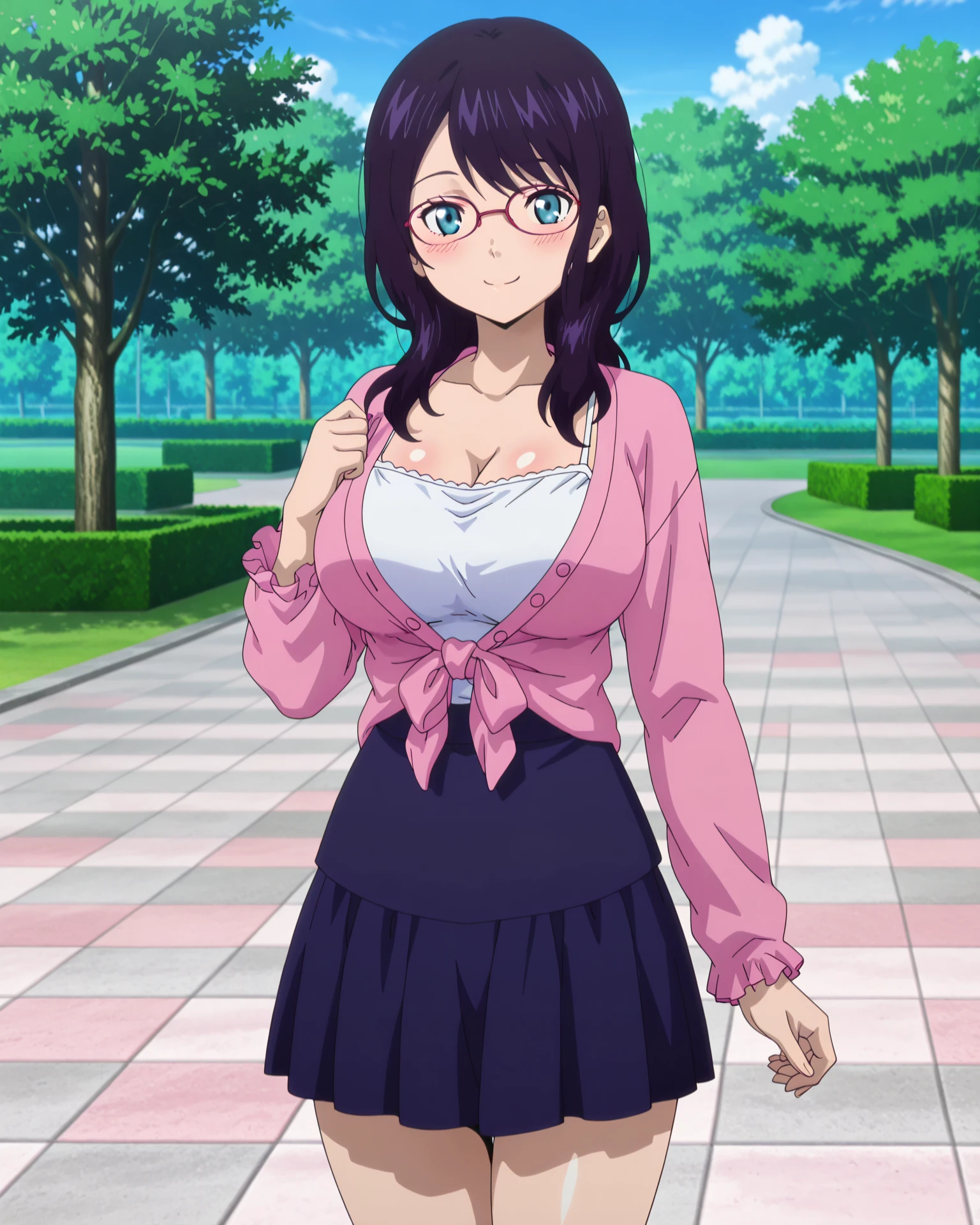 glasses, pink cardigan, tied cardigan, long sleeves, frilled sleeves, white camisole, cleavag, navy blue skirt,