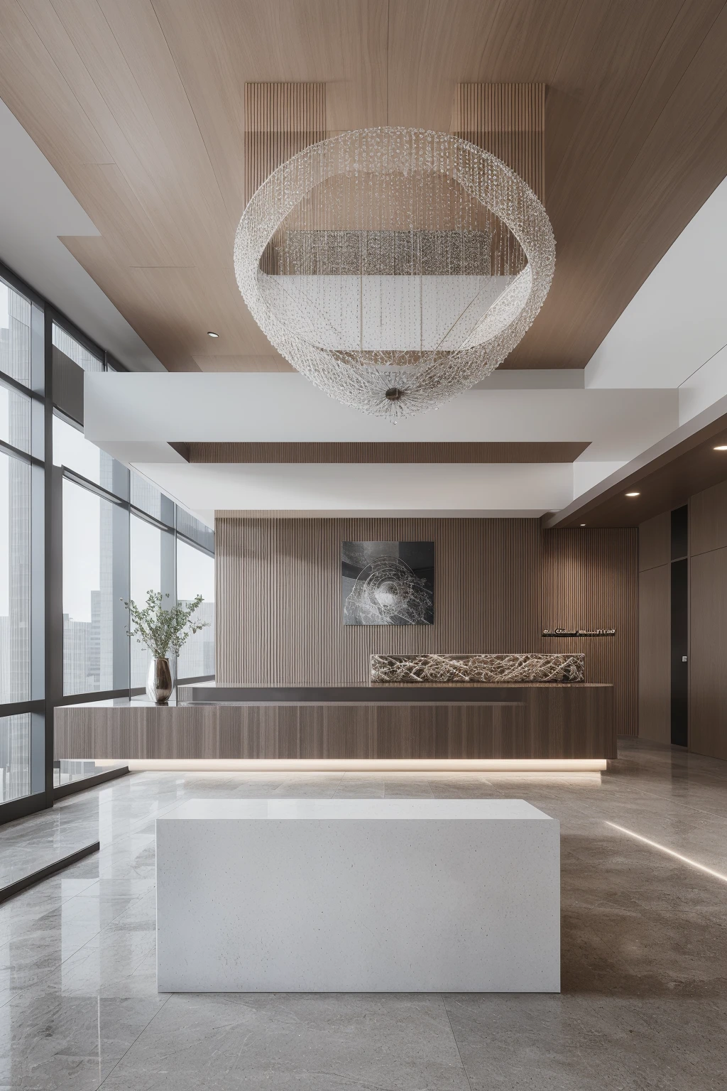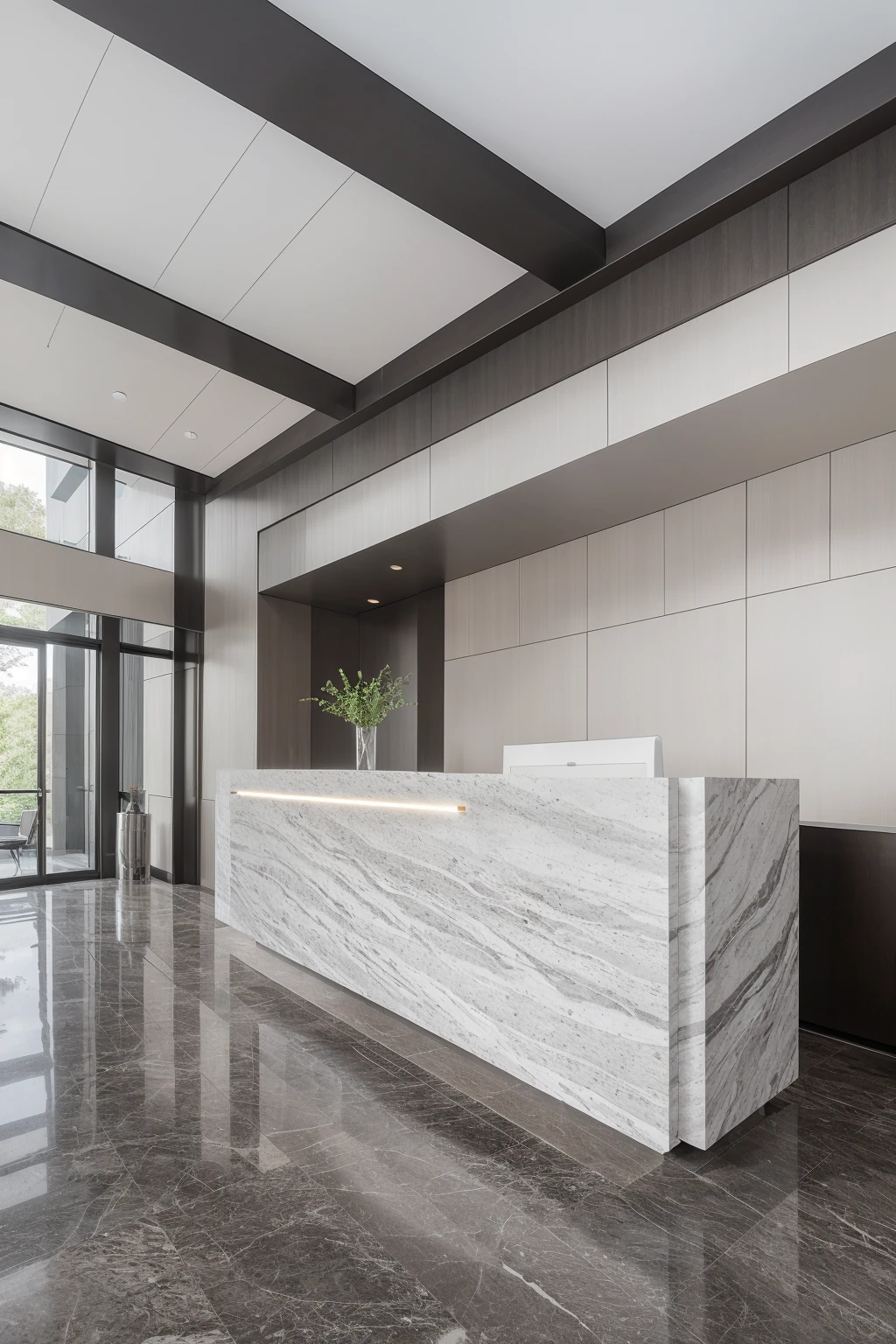 The office reception lobby in a small office building has a simple style, with both marble and wood grain materials performing well.