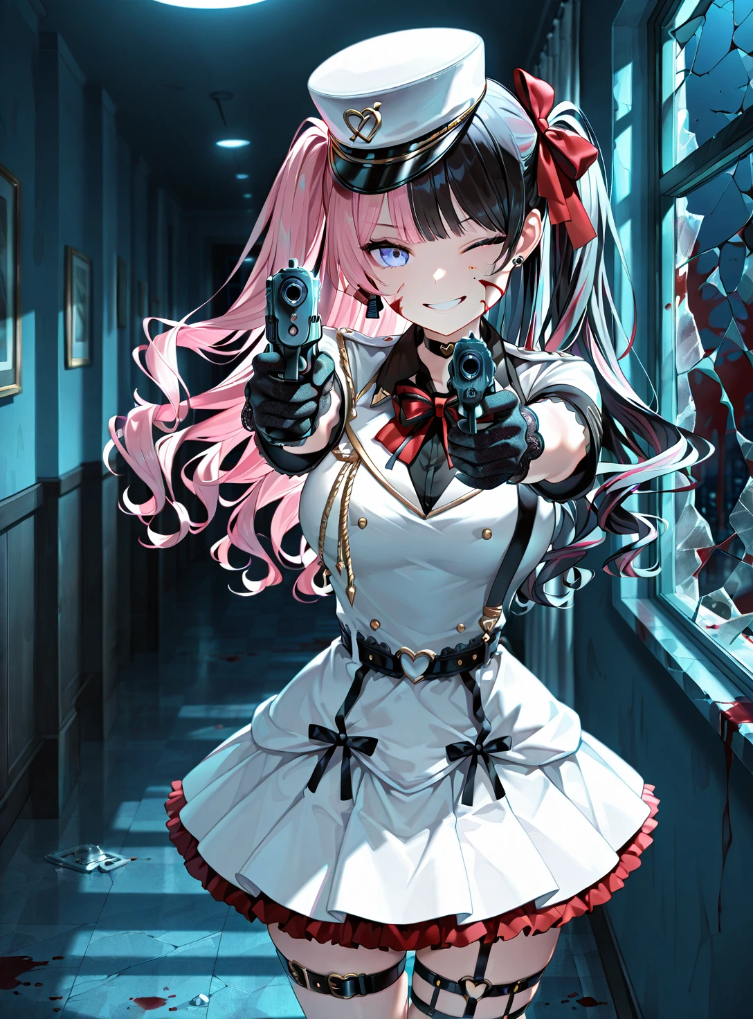 "HinanoMilitary, two-tone hair, two side up, red hair bow,"