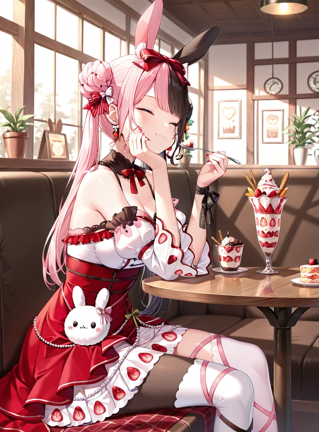 HinanoIchigoDress, two-tone hair,double bun, twintails, rabbit ears,red hair bow, asymmetrical hair ornament, asymmetrical food-themed earrings,strapless layered dress, detached collar, asymmetrical detached sleeves, wrist ribbon,animal bag,asymmetrical thigh boots, single pantyhose,