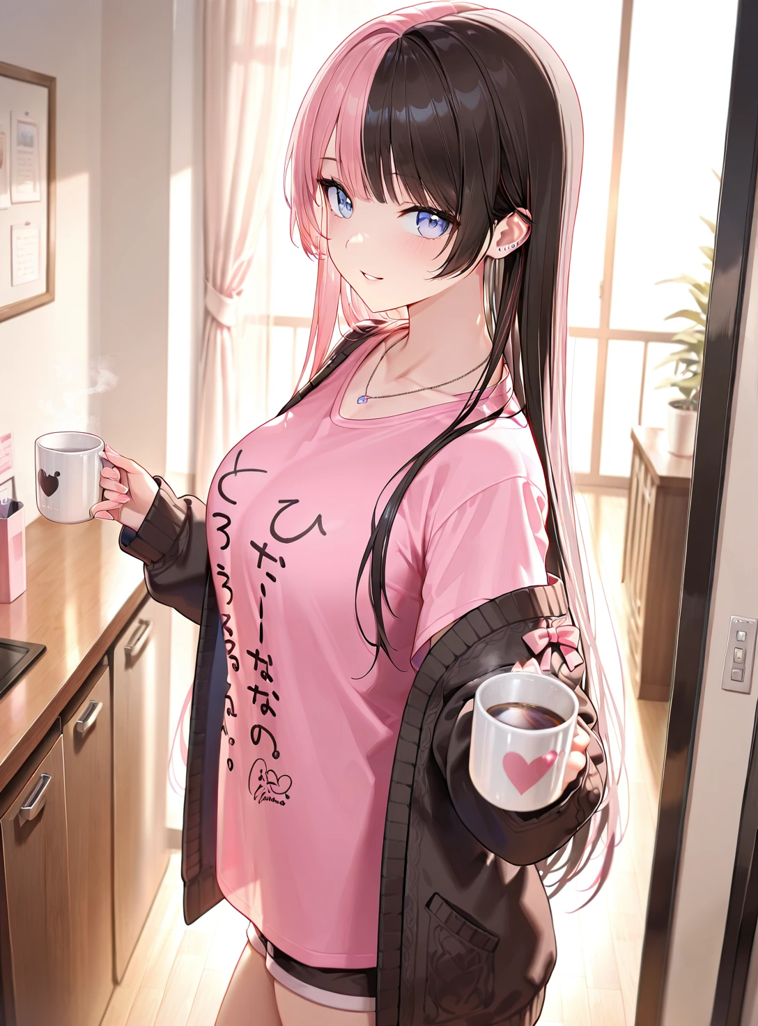 HinanoRoomwear, two-tone hair, long straight hair, pendant, t-shirt, open cardigan, short shorts,
