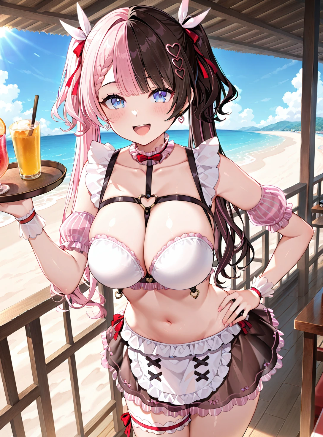 HinanoSwimsuit2024, two-tone hair, twintails, two side up, hair ribbon, heart hair ornament, heart earrings, frilled choker, maid bikini, chest harness, detached sleeves, see-through skirt, bridal garter,