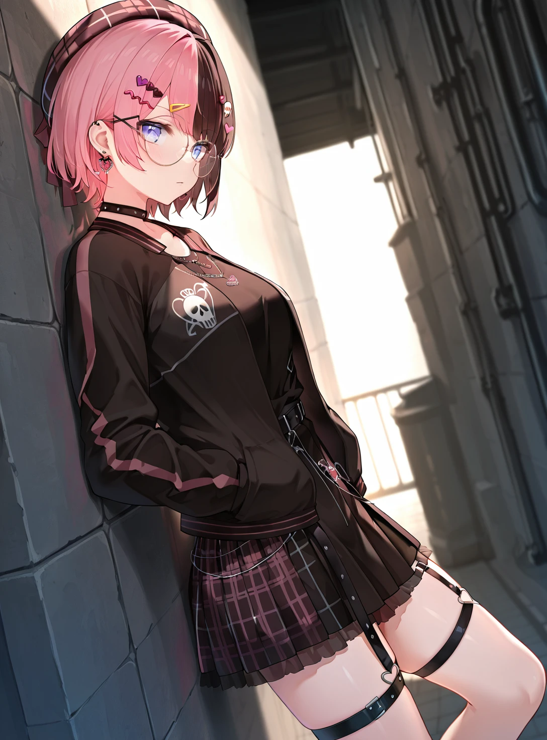 HinanoGothicpunk, short hair, two-tone hair, hairclips, heart earring, round eyewear, beret, black choker, skull print open jacket, chain necklace, black shirt, layered miniskirt, thigh strap,