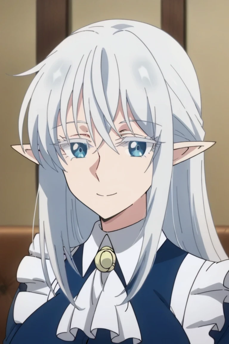 Schnee raizer, white hair, long hair, pointy ears, elf, hair between eyes, blue eyes,