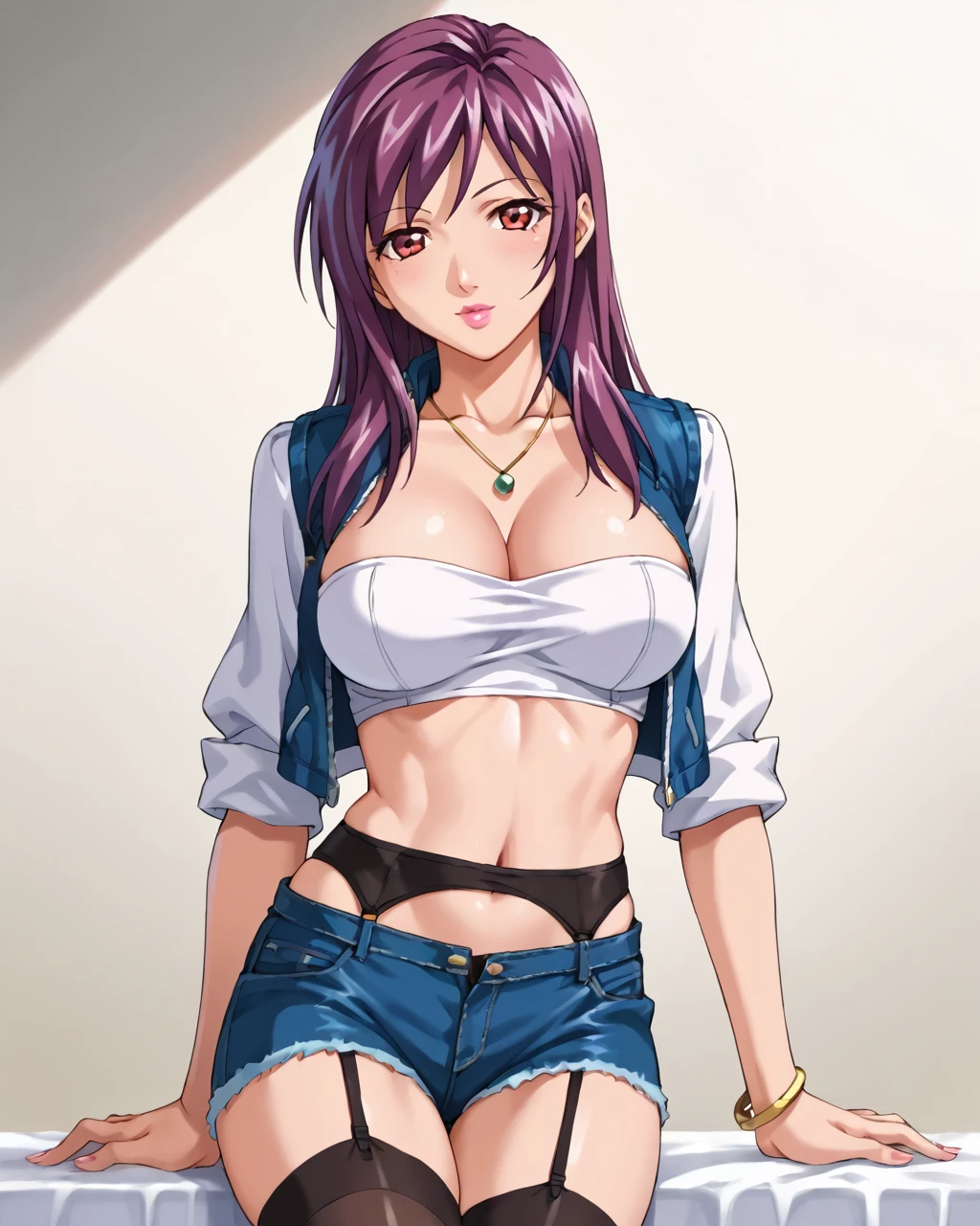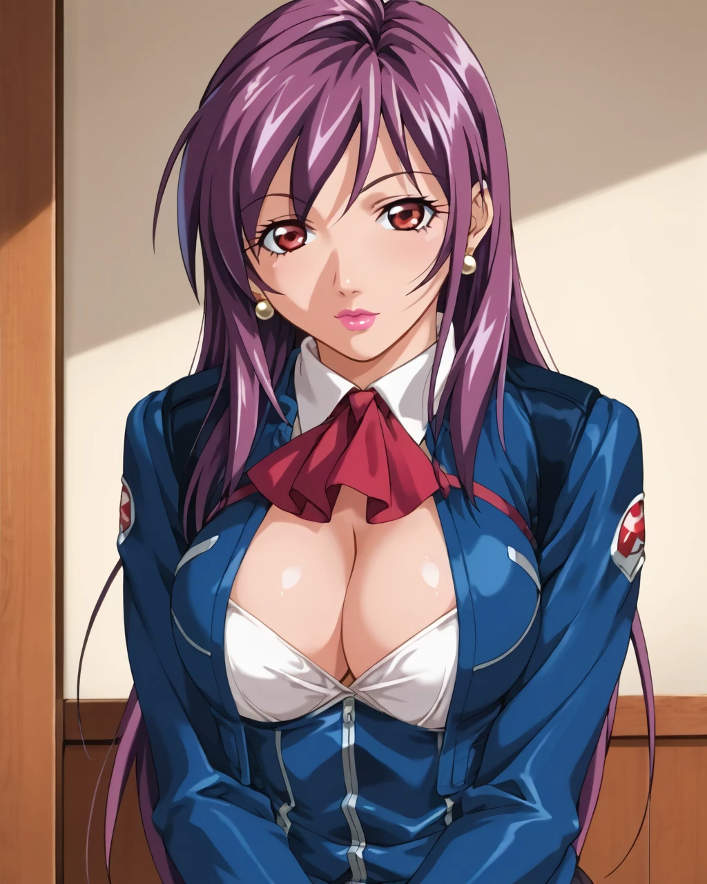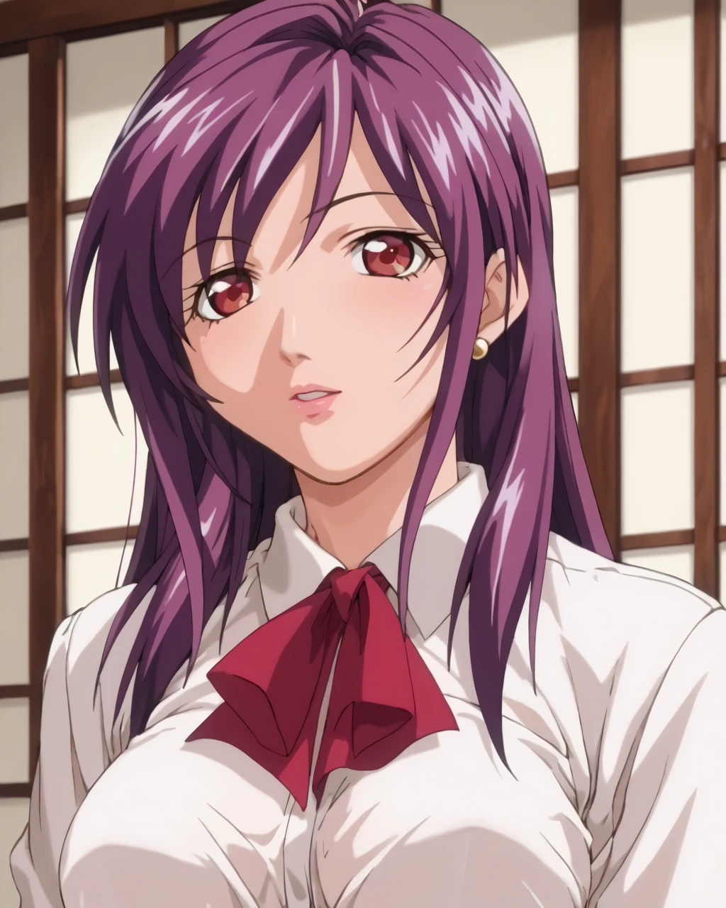 Aki Ichikawa, ichikawa, purple hair, long hair, red eyes, large breasts, 1girl, solo, retro artstyle, 1990s (style)
