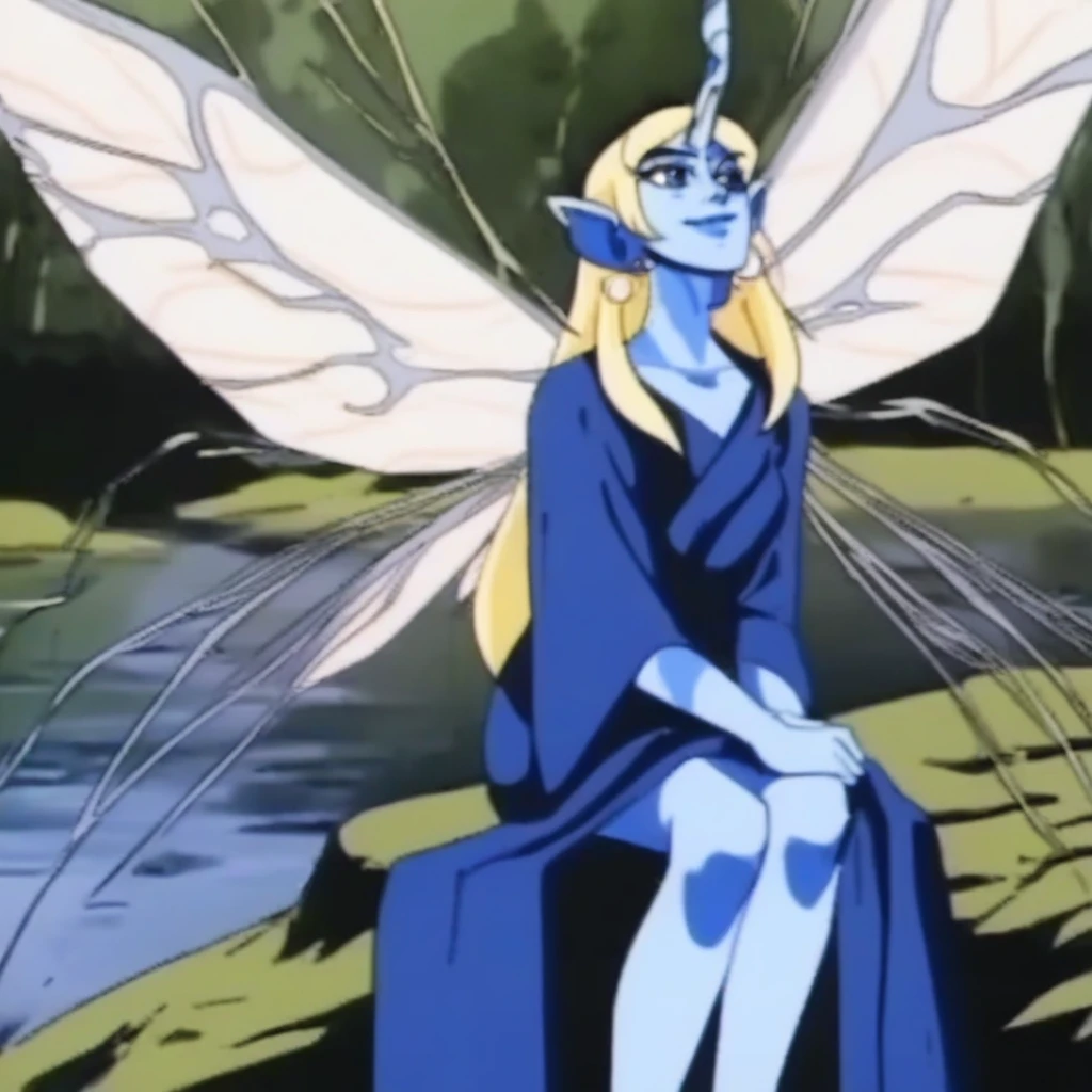 female, fairy, pointy ears, blonde hair, long hair, single horn, blue skin, blue eyes, blue lips, round earrings, fairy wings, slender