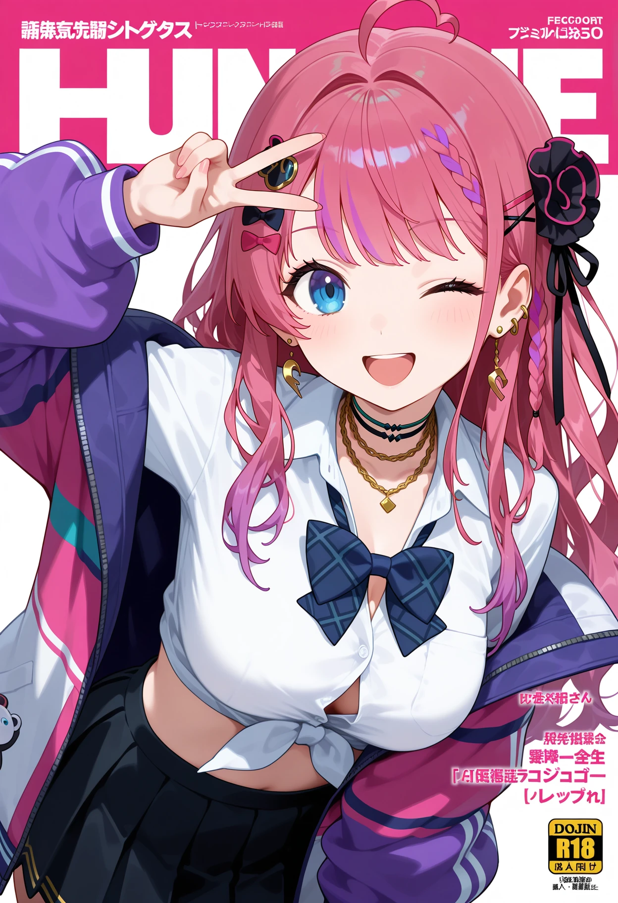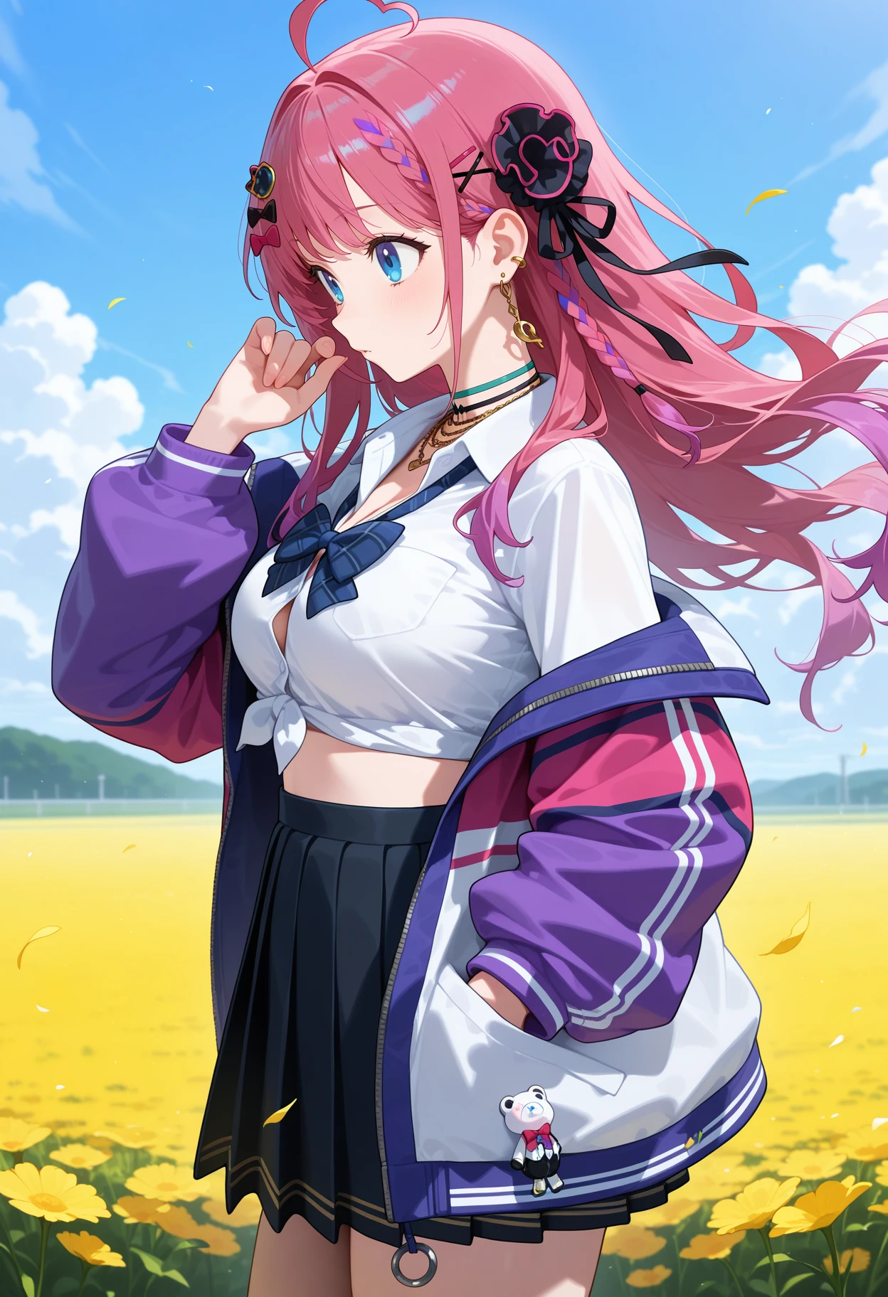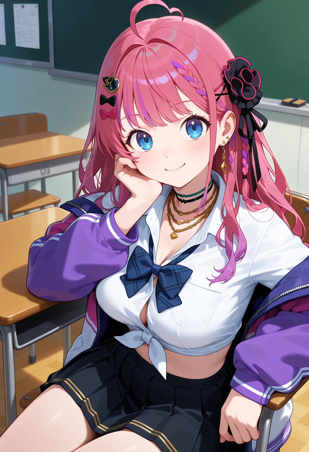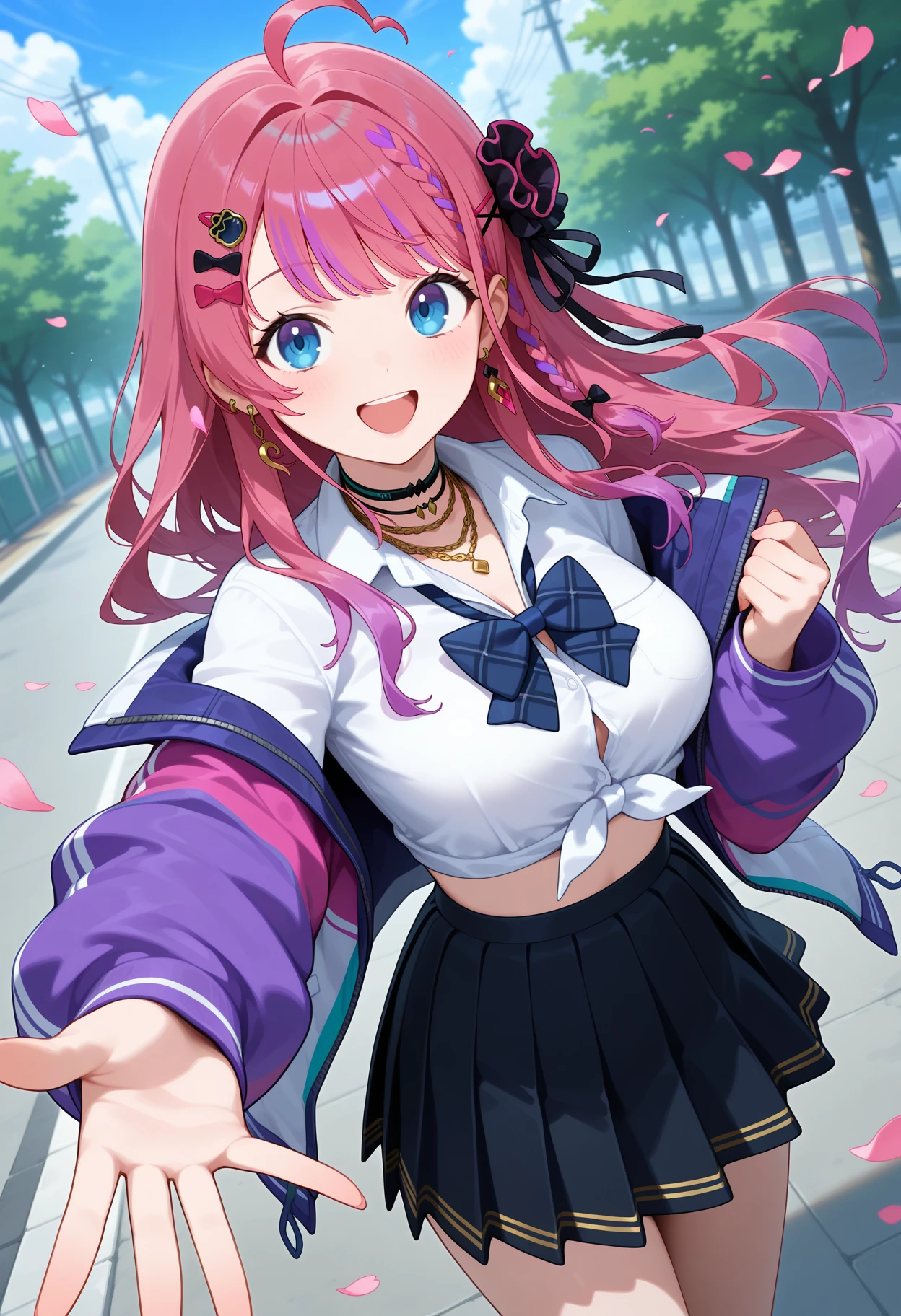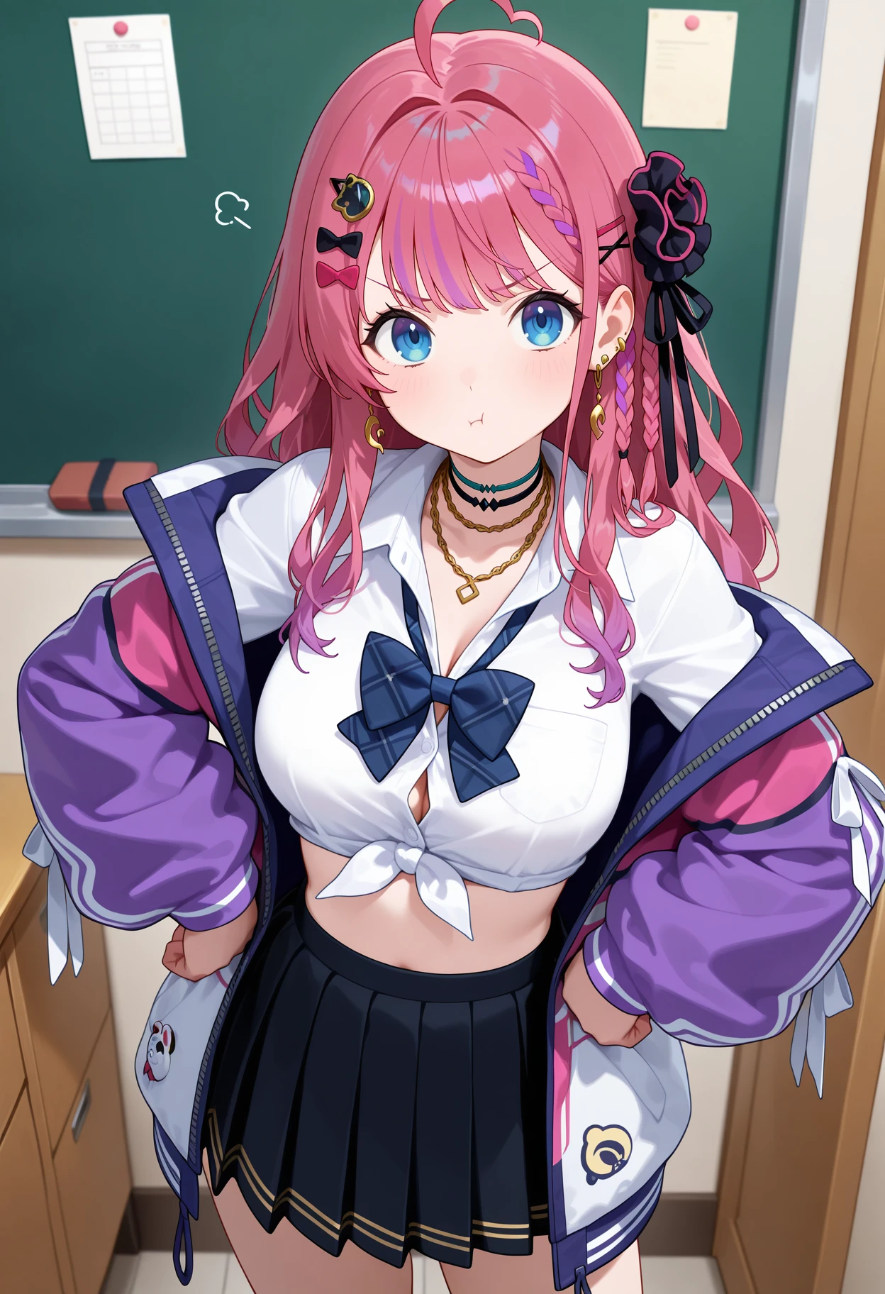 outfit2bbmeruto, long hair, pink hair, ahoge, braid, hair ornament, hair bow, earrings, blue eyes, choker, necklace, school uniform, loose bowtie, collared shirt, white shirt, off shoulder, purple jacket, long sleeves, midriff, pleated skirt, black skirt