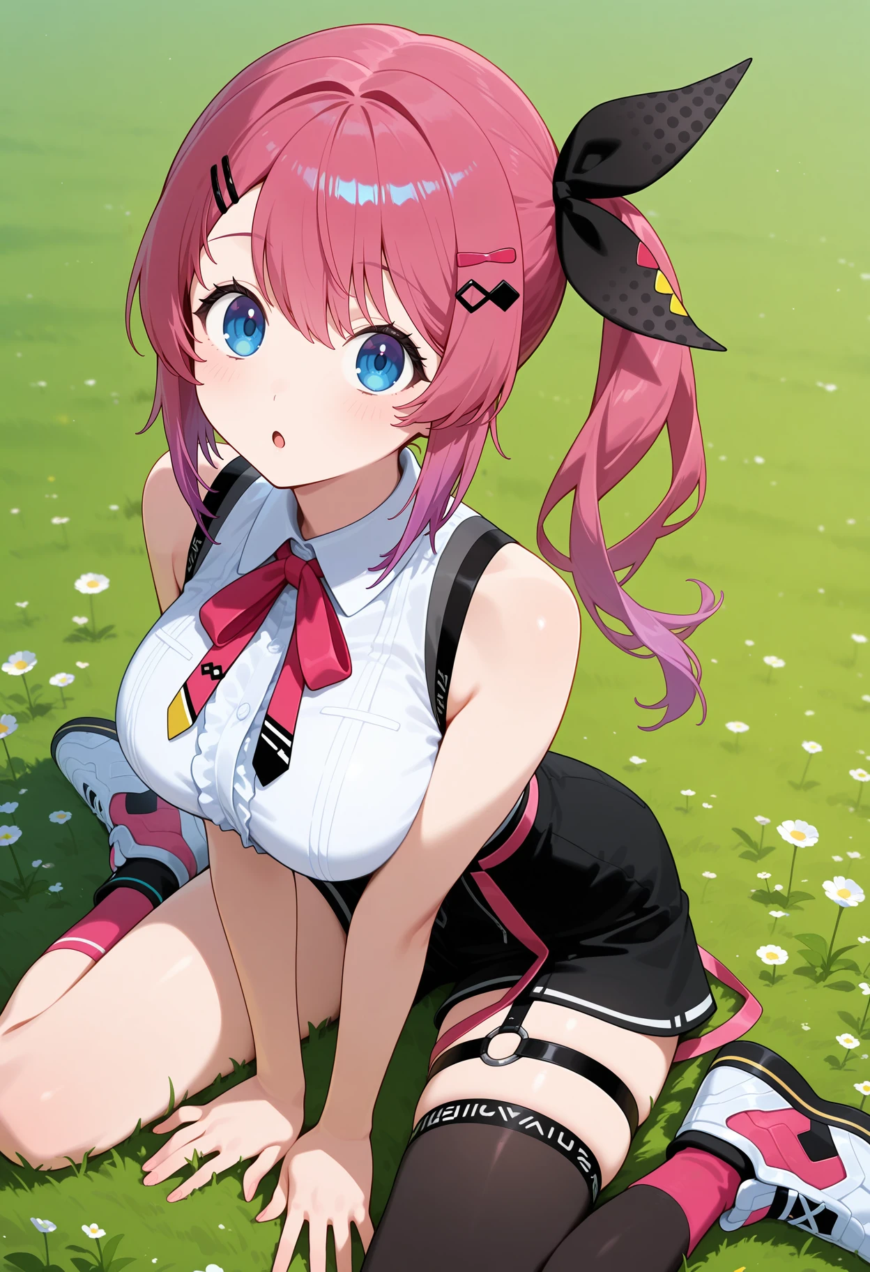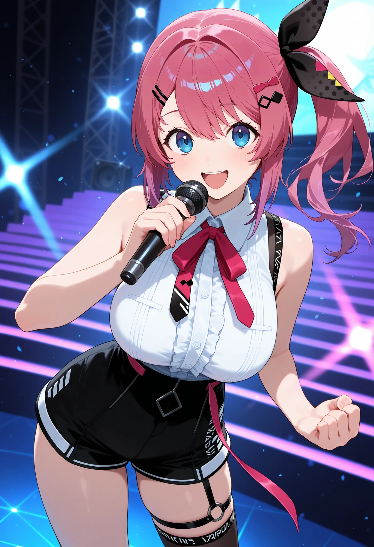 outfit1-2aameruto, pink hair, side ponytail, hair ribbon, hair bow, hair ornament, hairclip, blue eyes, neck ribbon, collared shirt, white shirt, sleeveless, black shorts, thigh strap, single thighhigh, black thighhighs