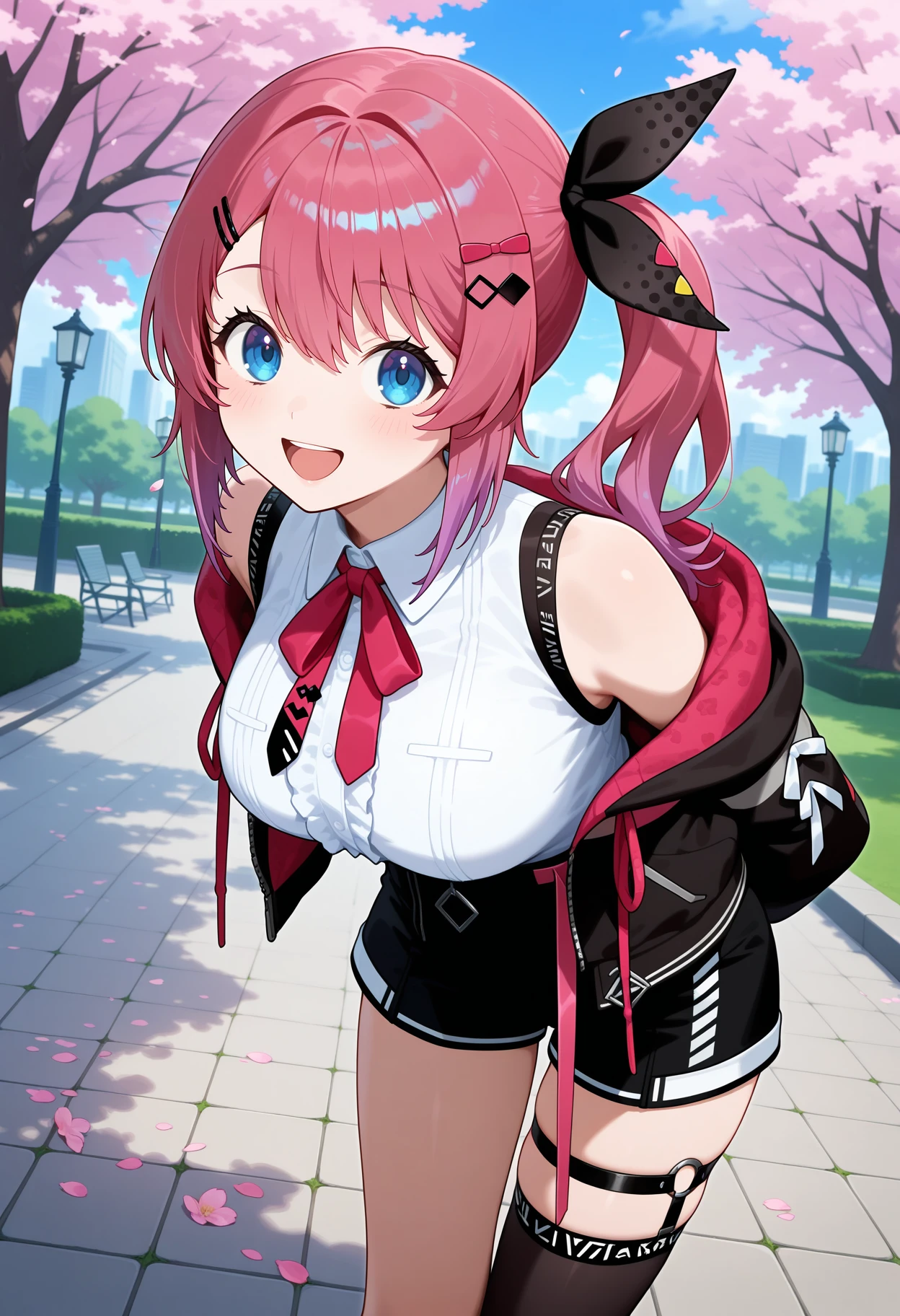 outfit1-1aameruto, pink hair, side ponytail, hair ribbon, hair bow, hair ornament, hairclip, blue eyes, neck ribbon, collared shirt, white shirt, sleeveless, off shoulder, black jacket, long sleeves, black shorts, thigh strap, single thighhigh, black thighhighs