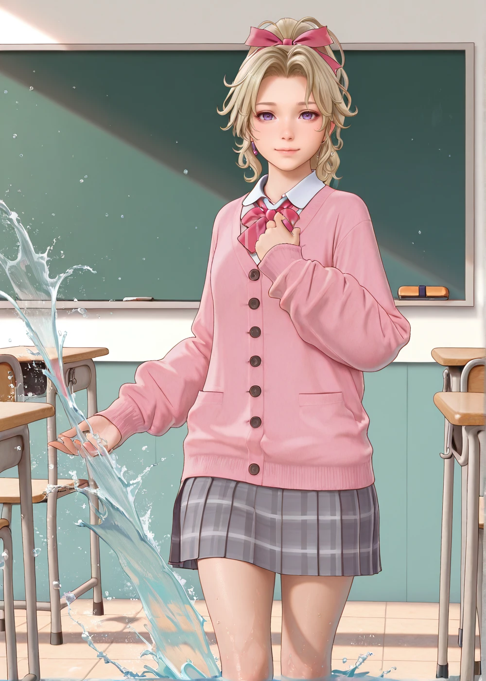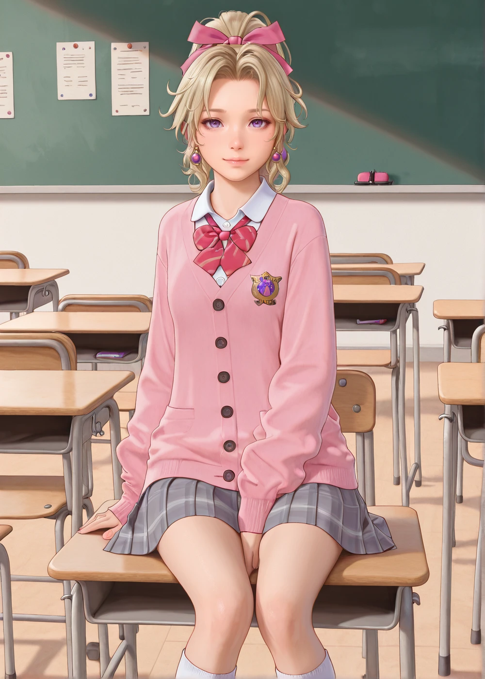 Terra Branford (Dissidia Duellum), 1girl, solo, grey skirt, white socks, loafers, blonde hair, purple eyes, school uniform, pink cardigan, red ribbon