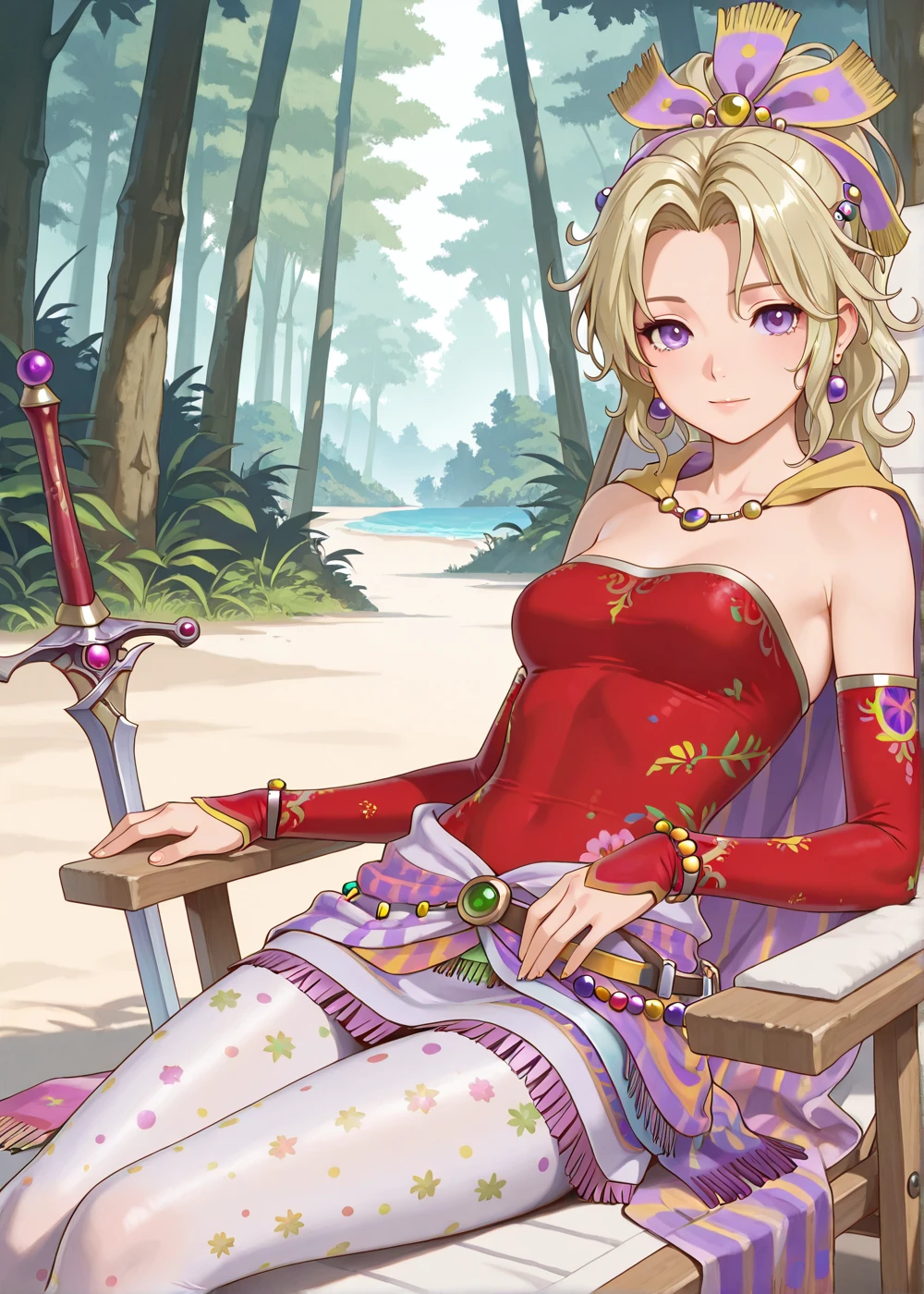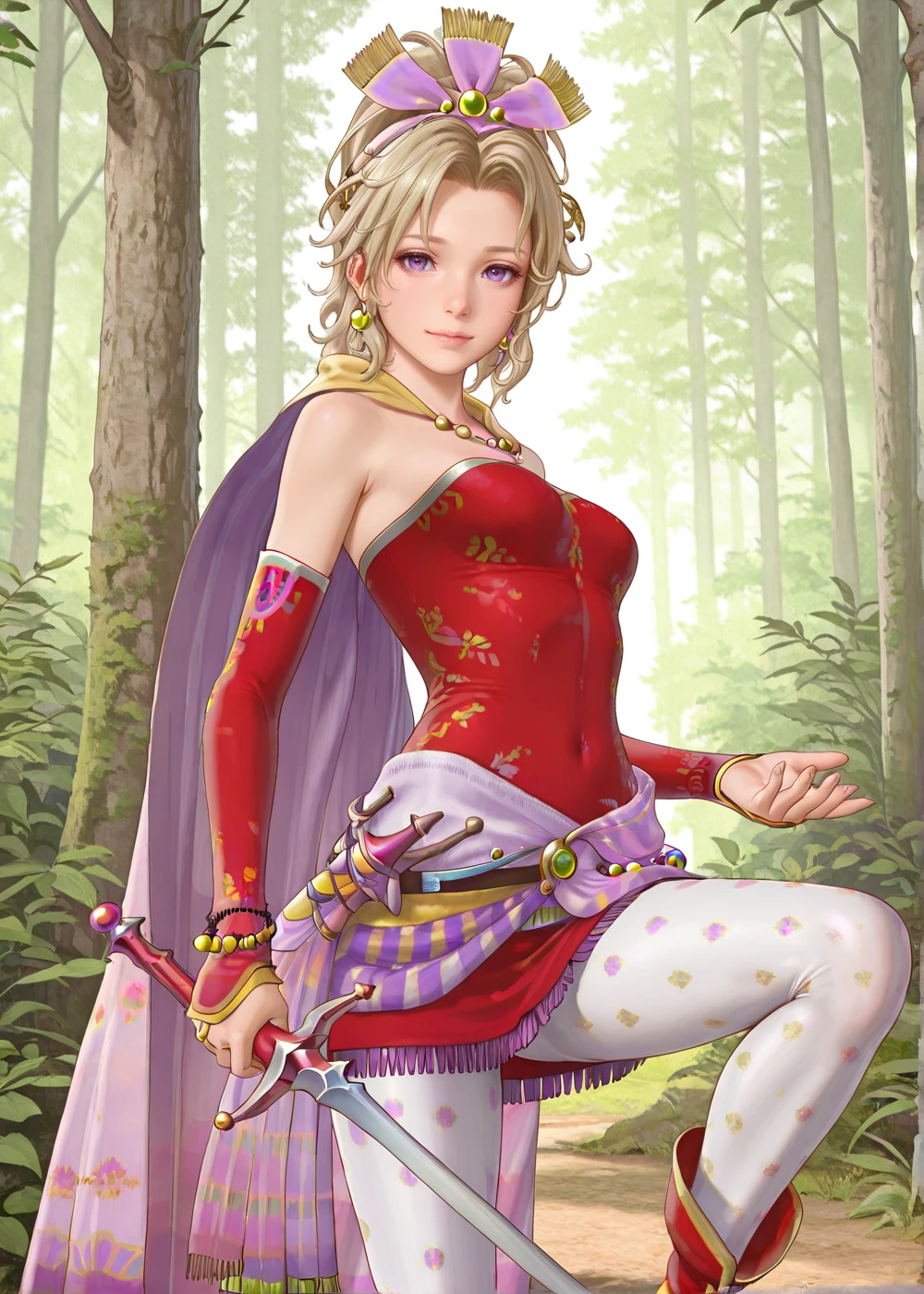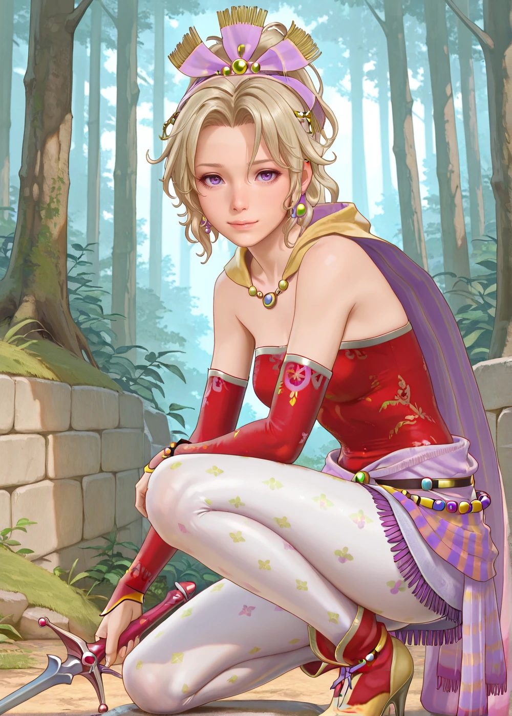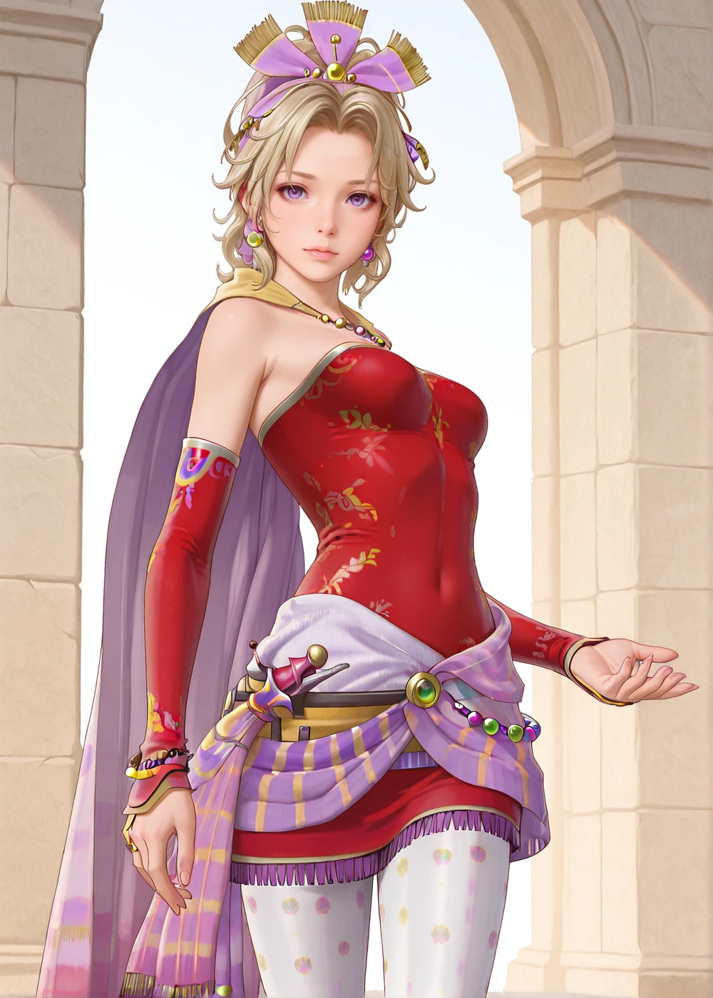 Terra Branford (Dissidia Duellum), 1girl, solo, pantyhose, detached sleeves, dress, cape, jewelry, earrings, purple eyes, blonde hair, strapless, bare shoulders