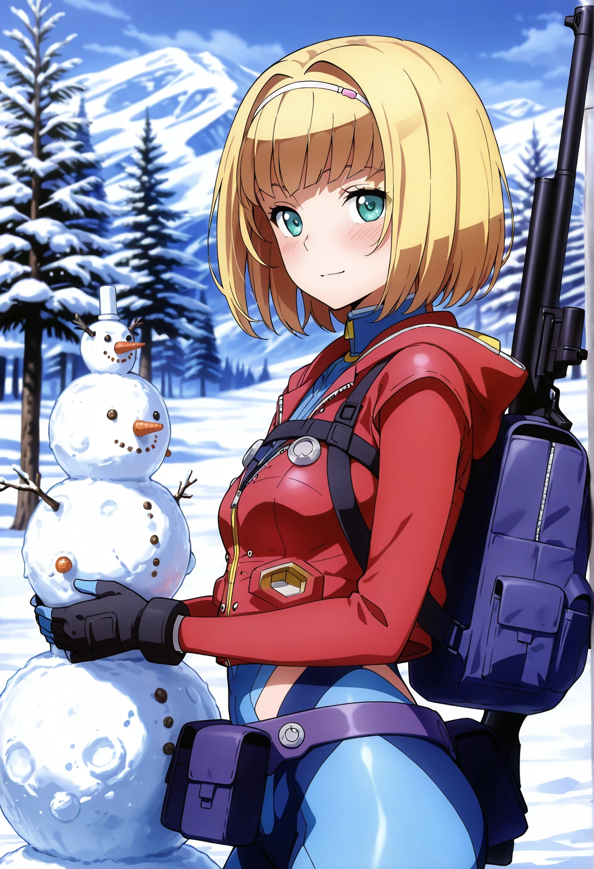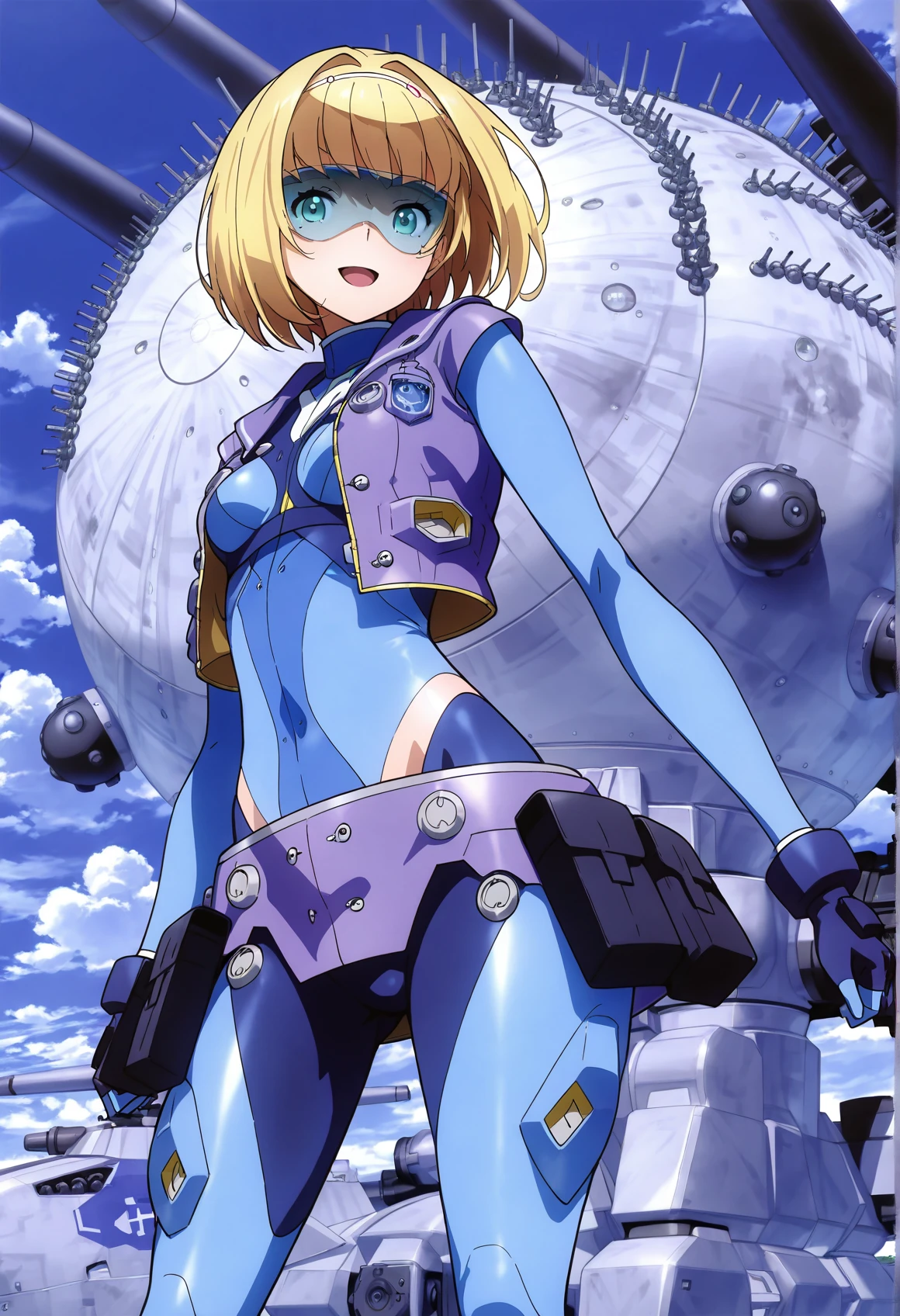 pilot suit,cropped jacket,purple jacket,,emblem, blue ,belt,belt pouch,gloves,boots,
