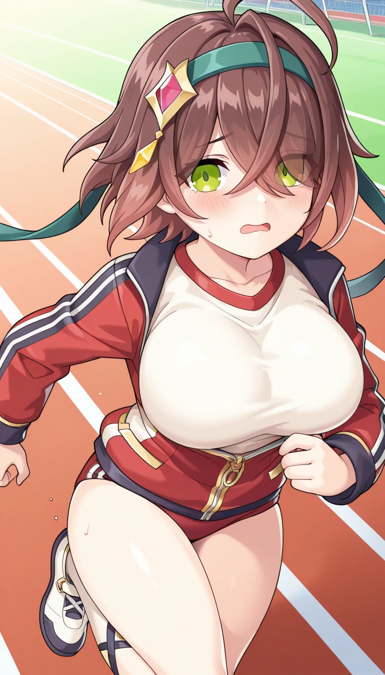 Gym uniform Costume: hades\(legend clover\), gymCostume, 1girl, short hair, brown hair, gradient hair, ahoge, crossed bangs, hair between eyes, hair over one eye, eyes visible through hair, hair ornament, green headband, green eyes, large breasts, white shirt, two-tone jacket, open jacket, red jacket, track jacket, gym shirt, red track suit, long sleeves, partially unzipped, zipper, zipper pull tab, gold trim, red buruma, kneehighs, white socks, sneakers, white footwear, ankle_lace-up,