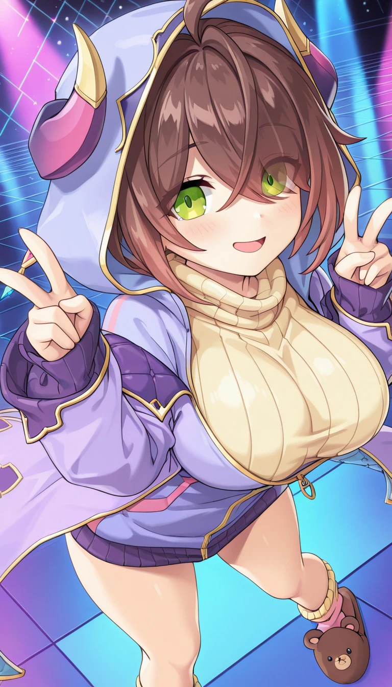 Alternate costume (V2): hades\(legend clover\), alternateCostume, 1girl, short hair, brown hair, gradient hair, ahoge, hair between eyes, hair over one eye, eyes visible through hair, green eyes, blush, fake horns, hood, hood up, large breasts, off shoulder, two-sided coat, purple coat, blue coat, open hoodie, purple hoodie, ribbed sweater, turtleneck sweater, yellow sweater, sweater dress, long sleeves, sleeves past wrists, gold trim, quilted coat, partially unzipped, pink trim, pink socks, yellow socks, brown footwear, animal slippers,