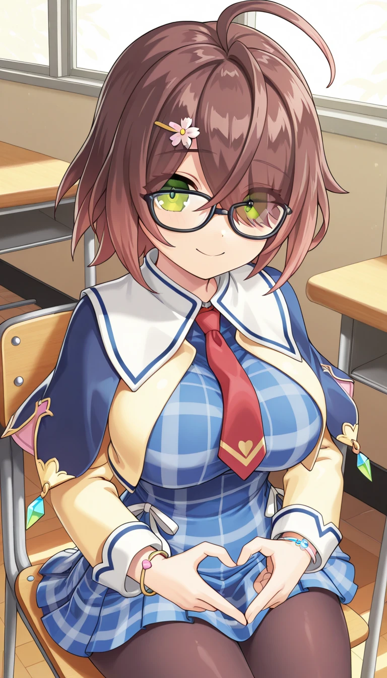 Schoolgirl costume: hades\(legend clover\), studentCostume, 1girl, short hair, brown hair, gradient hair, ahoge, hair between eyes, hair over one eye, eyes visible through hair, hairclip, hair flower, green eyes, glasses, black-framed eyewear, bracelet, large breasts, blue dress, short dress, pleated dress, plaid dress, school uniform, cropped jacket, yellow jacket, side capelet, blue capelet, pink capelet, red necktie, sailor collar, white sailor collar, white ribbon, blue trim, brown pantyhose, black footwear, loafers,