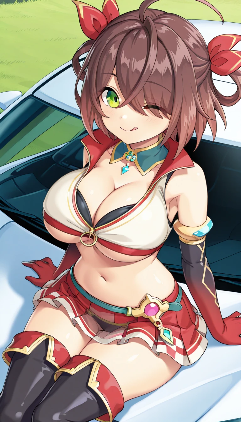 Race Costume: hades\(legend clover\), raceCostume, race queen, 1girl, short hair, brown hair, gradient hair, ahoge, hair between eyes, hair over one eye, eyes visible through hair, green eyes, hair bow, red bow, hair rings, large breasts, cleavage, underboob, collarbone, bare shoulders, armpits, white vest, collared vest, wing collar, aqua collar, black bra, bra peek, midriff, stomach, navel, belt, buckle, partially unzipped, red trim, gold trim, two-tone gloves, black gloves, red gloves, elbow gloves, armlet, pleated skirt, miniskirt, red skirt, see-through skirt, black panties, thigh boots, black footwear, checkered print,