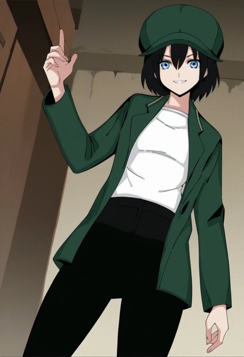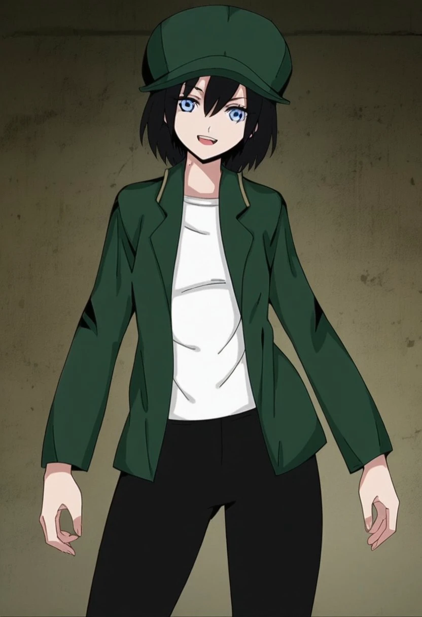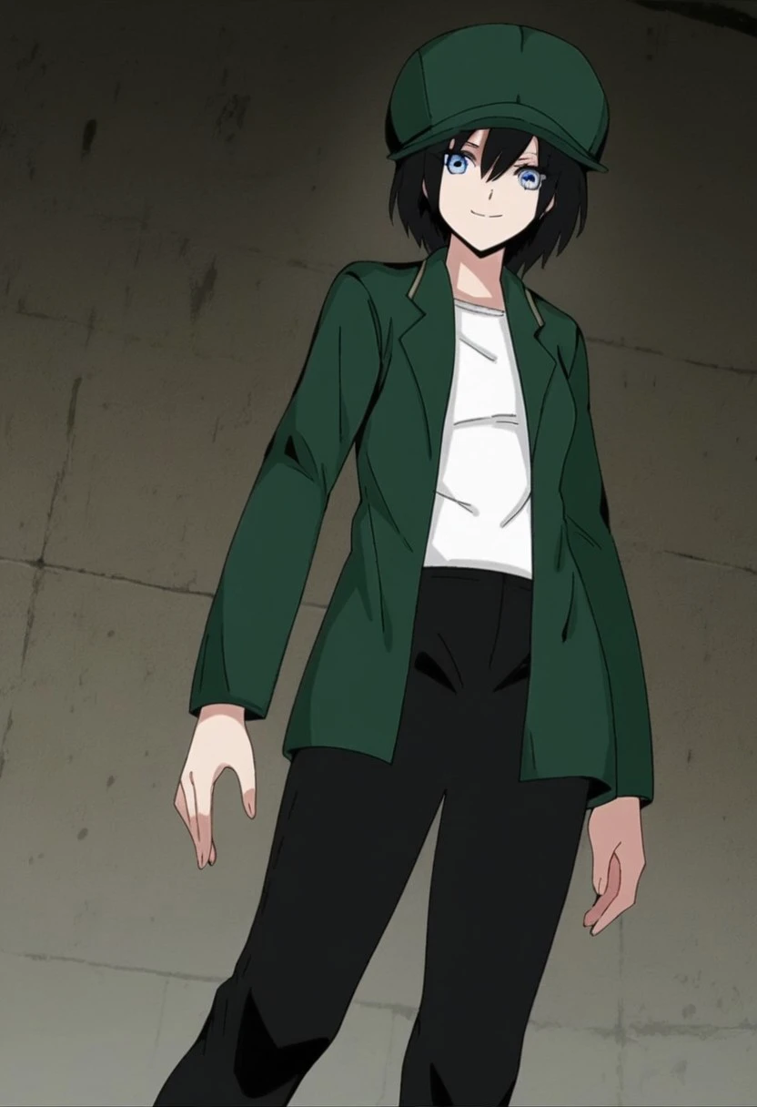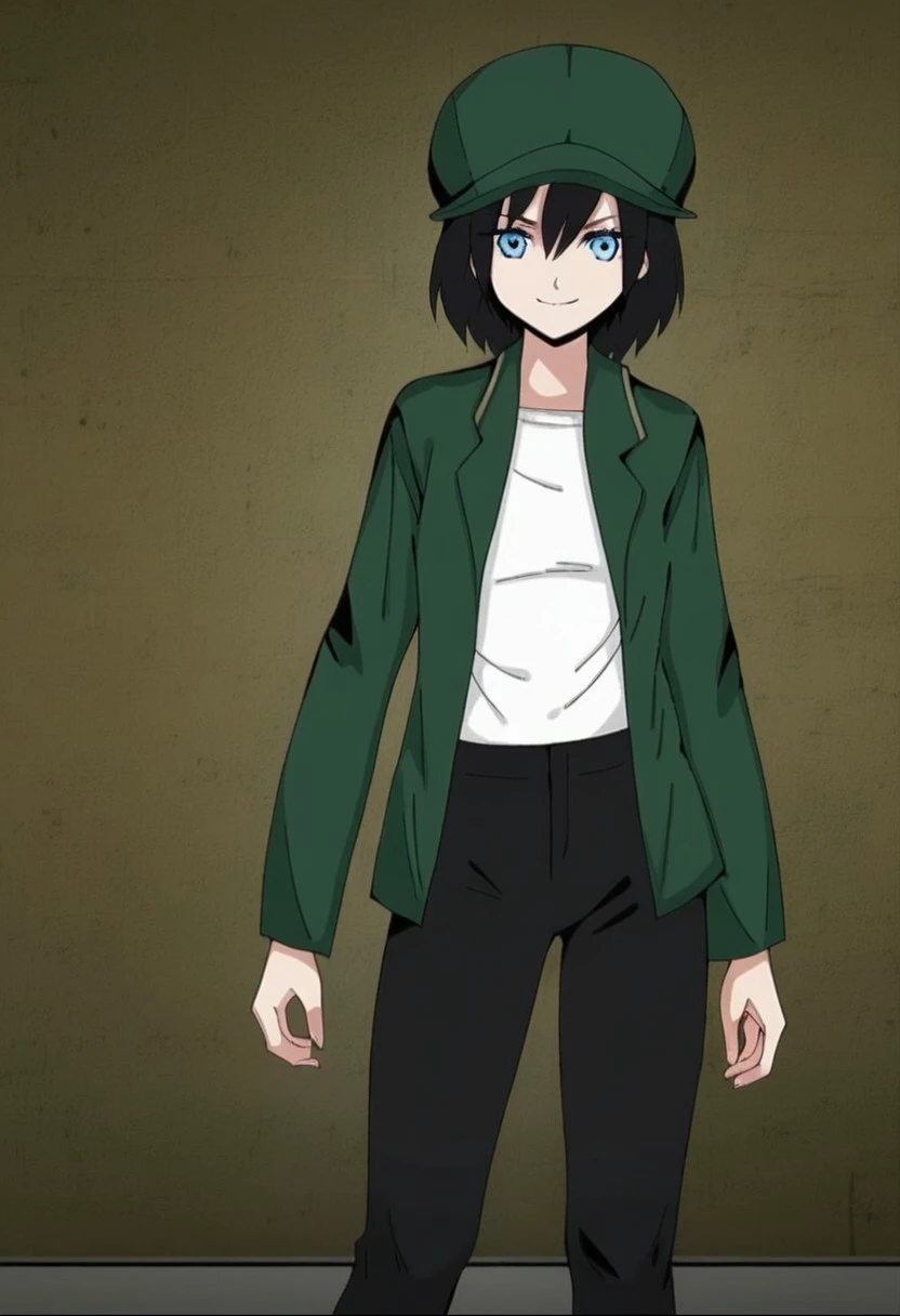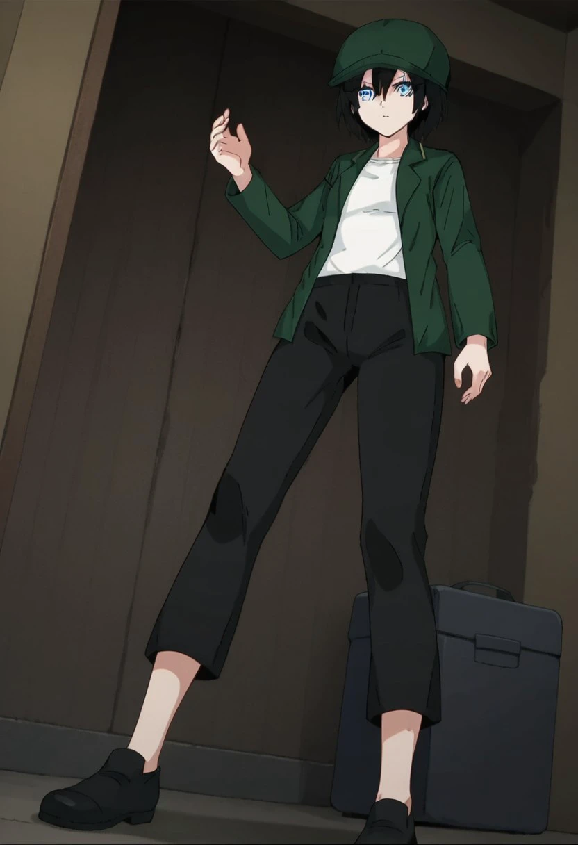 green jacket, green headwear,open clothes,open jacket hat, shirt, white shirt,pants, black pants,black shoes,
