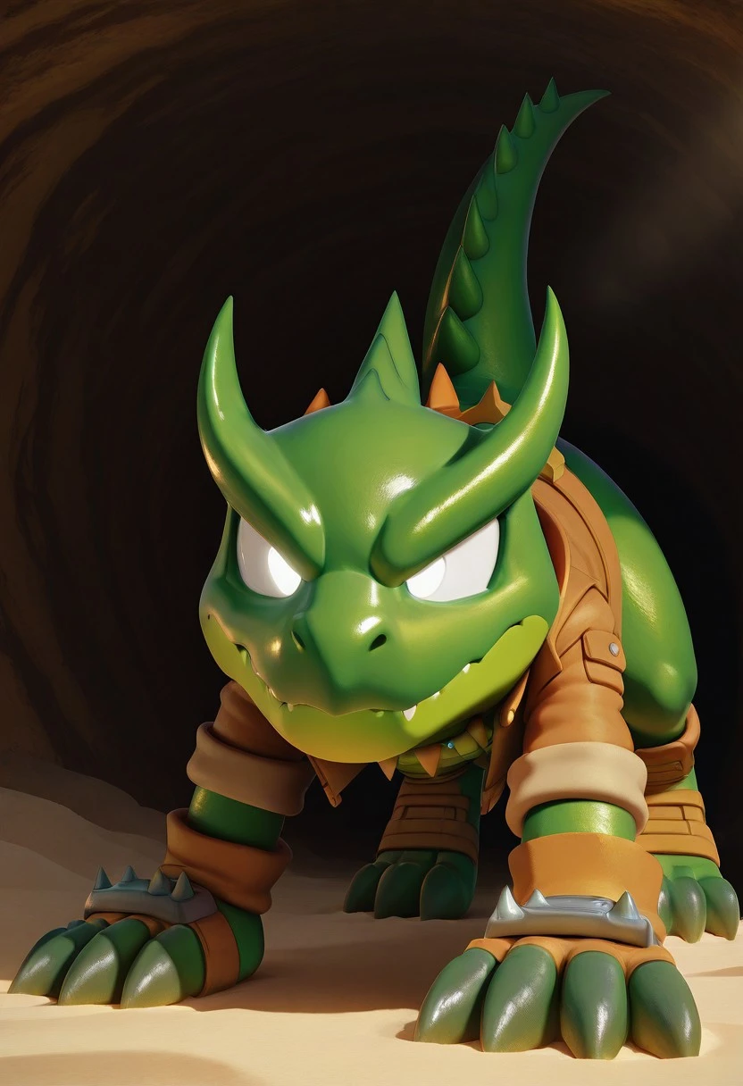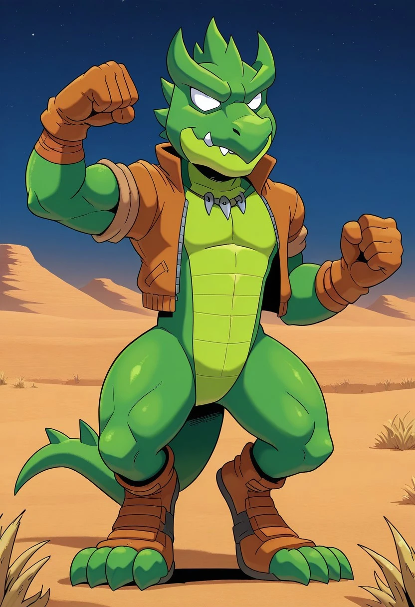 Tex the Lizard, green scaly skin, green horns, white eyes, long green tail, open brown jacket