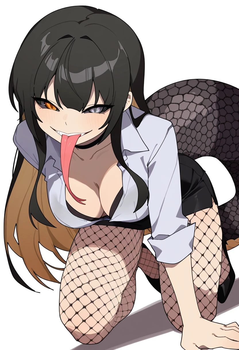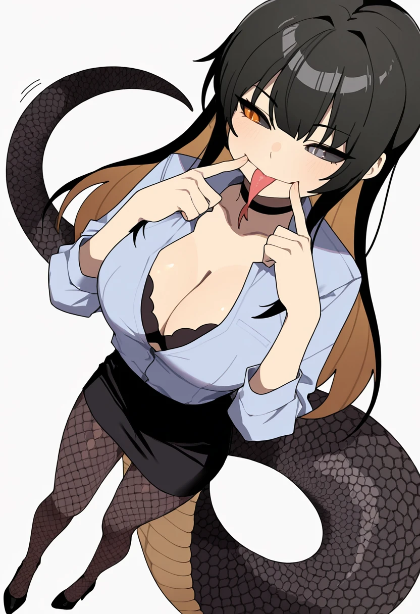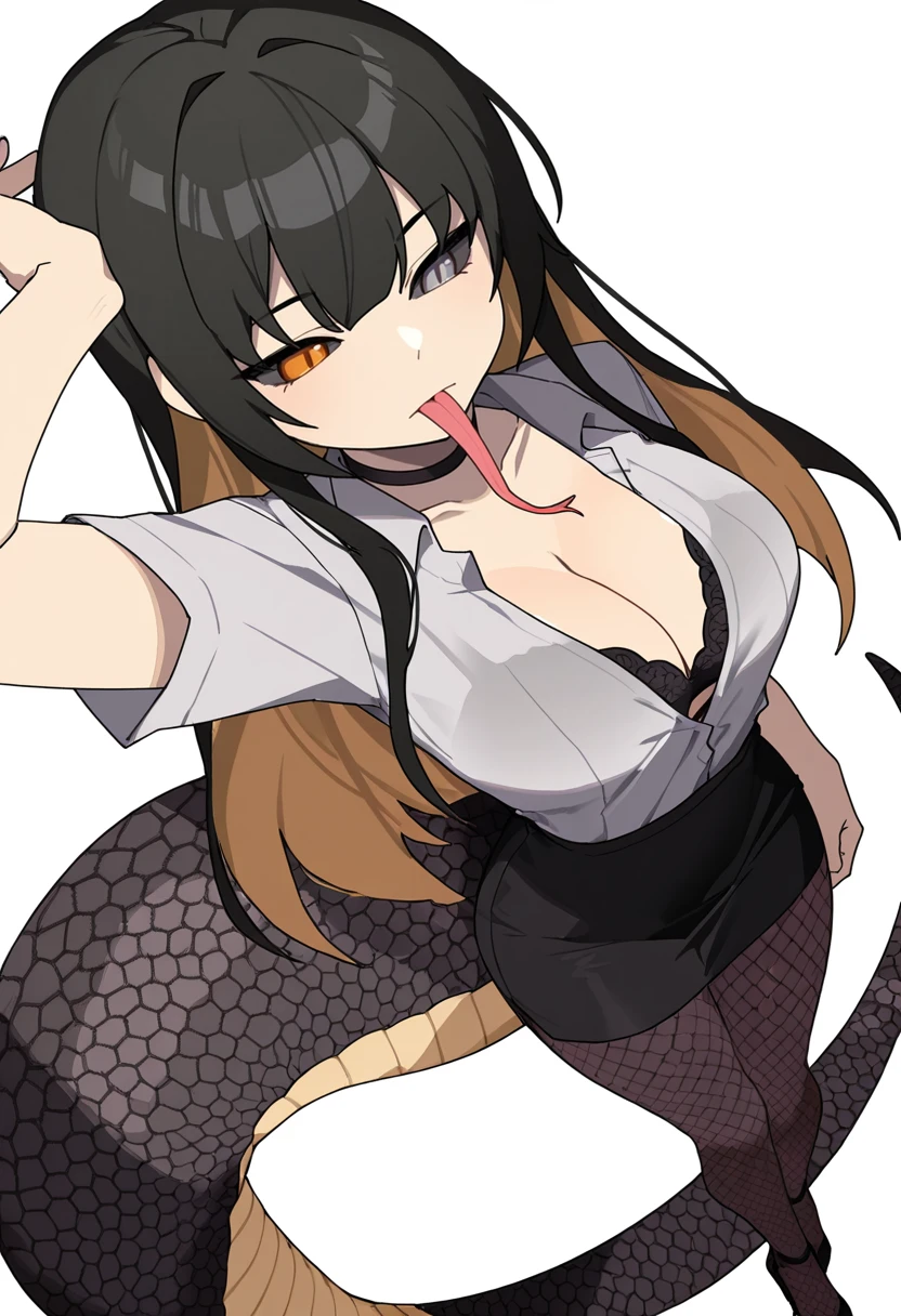 cobra_cnr, 1girl, long hair, black hair,colored inner hair,heterochromia,orange eyes, grey eyes,slit pupils,black sclera, forked tongue,long tongue,scales, monster girl, lamia, snake tail,👗Default Outfit