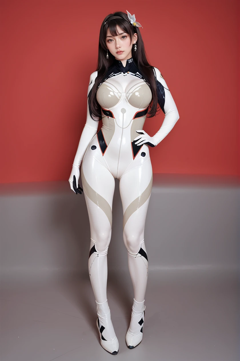 white bodysuit,skin tight,print bodysuit,black hairband,hair ornament