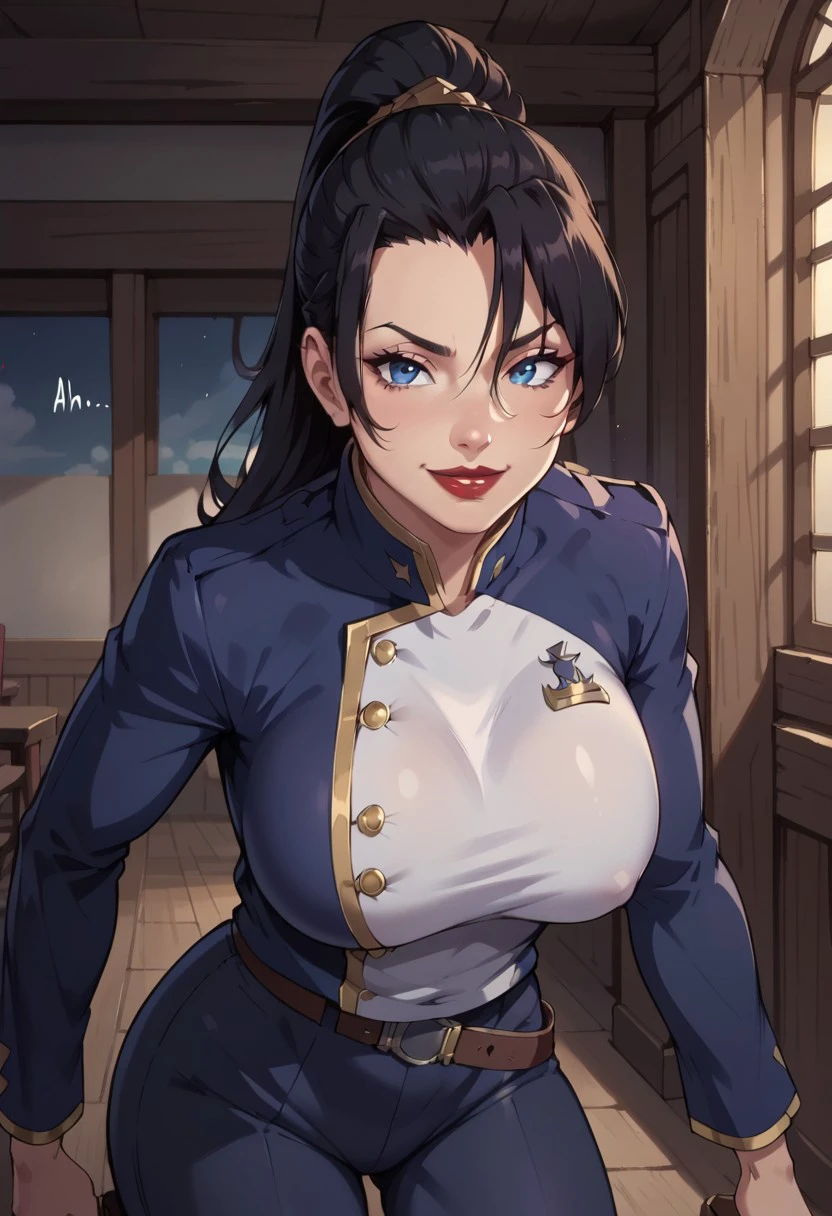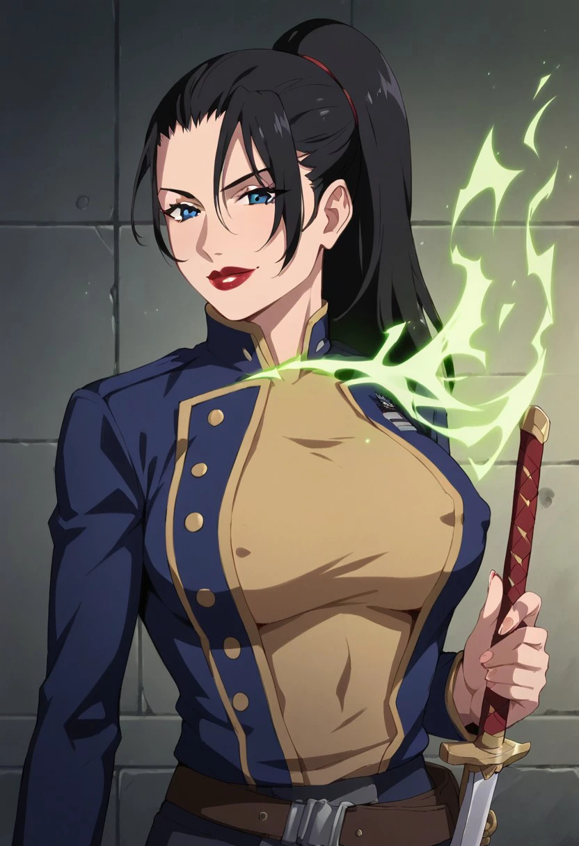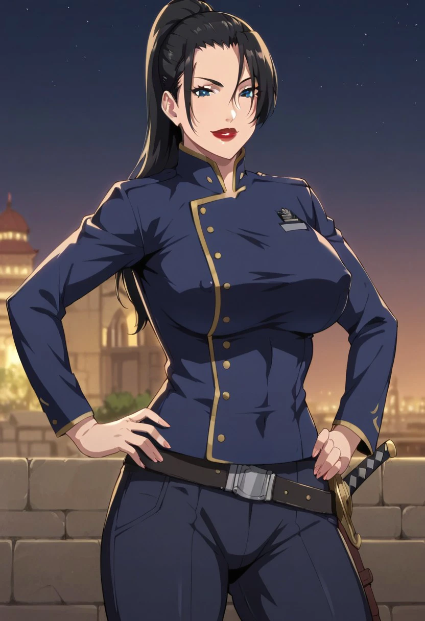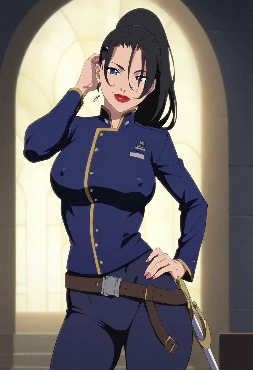 ShiseruNS, 1girl, solo, tall woman, curvaceous build, light-skinned woman, wavy hair, black hair, mid back-length hair, combed back hair, blue eyes, full lips, dark blue uniform, large breast, gold trimmings clothes, scars, red lipstick, ponytail, belt, blue pants, boots, military uniform, buttons, sword on the belt,