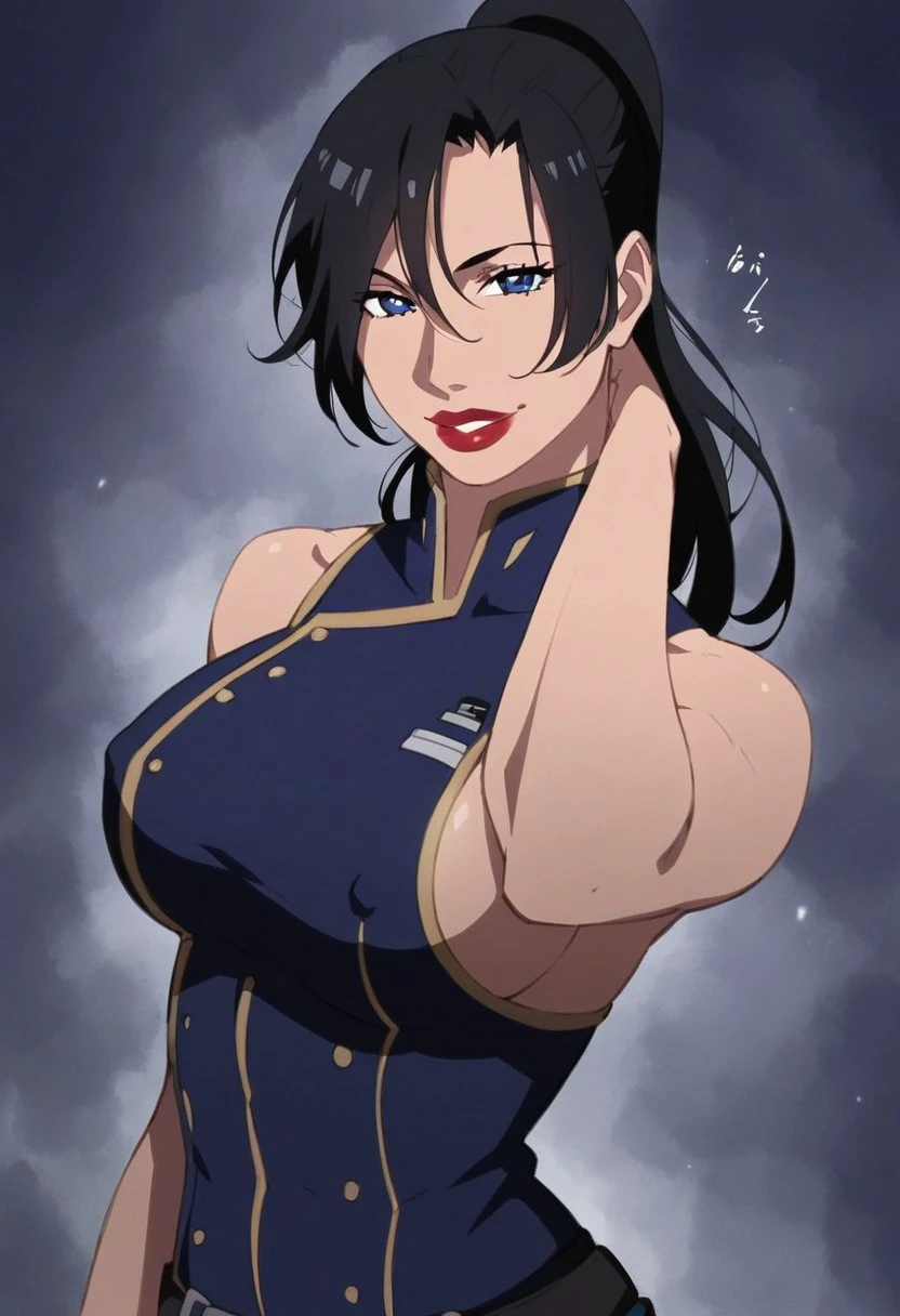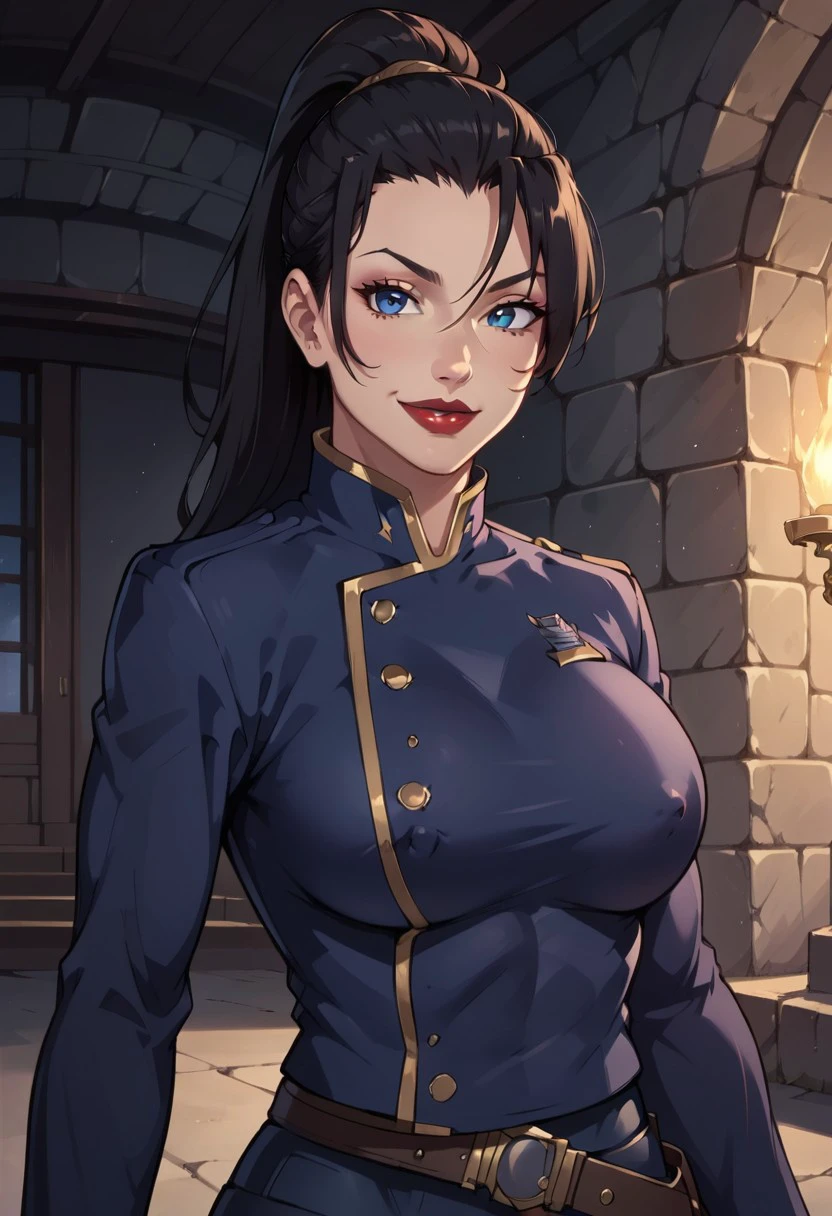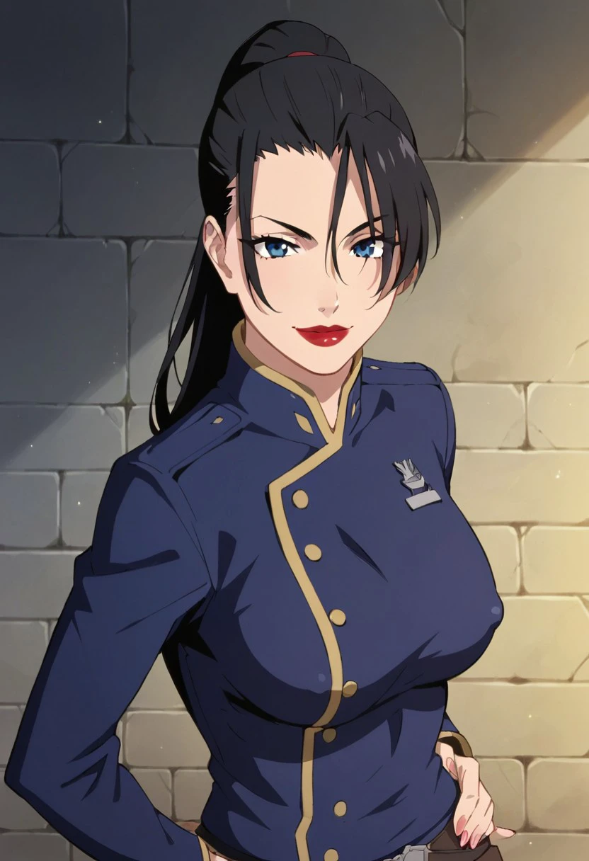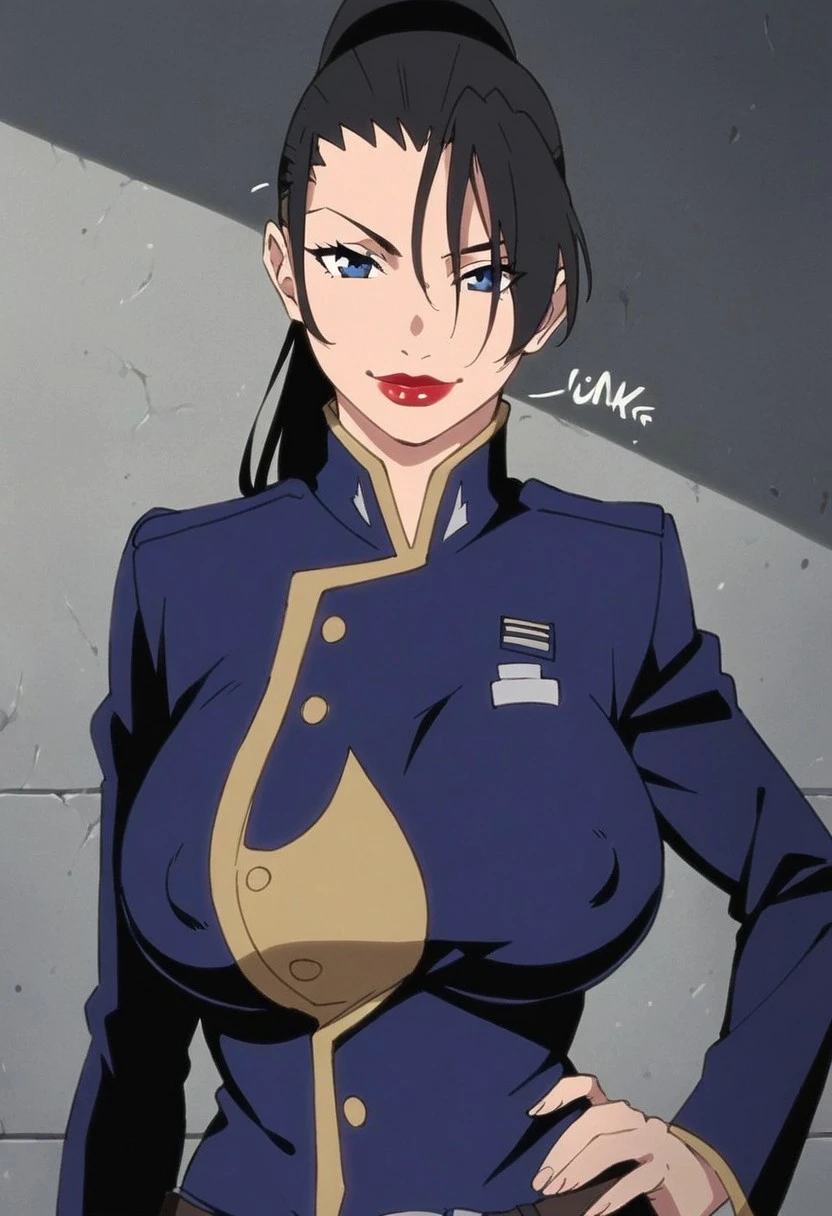 ShiseruNS, 1girl, solo, tall woman, curvaceous build, light-skinned woman, wavy hair, black hair, mid back-length hair, combed back hair, blue eyes, full lips, dark blue uniform, large breast, gold trimmings clothes, scars, red lipstick, ponytail, belt, blue pants, boots, military uniform, buttons, sword on the belt,