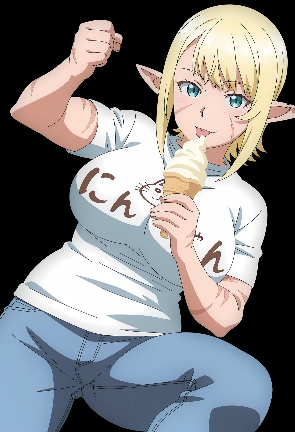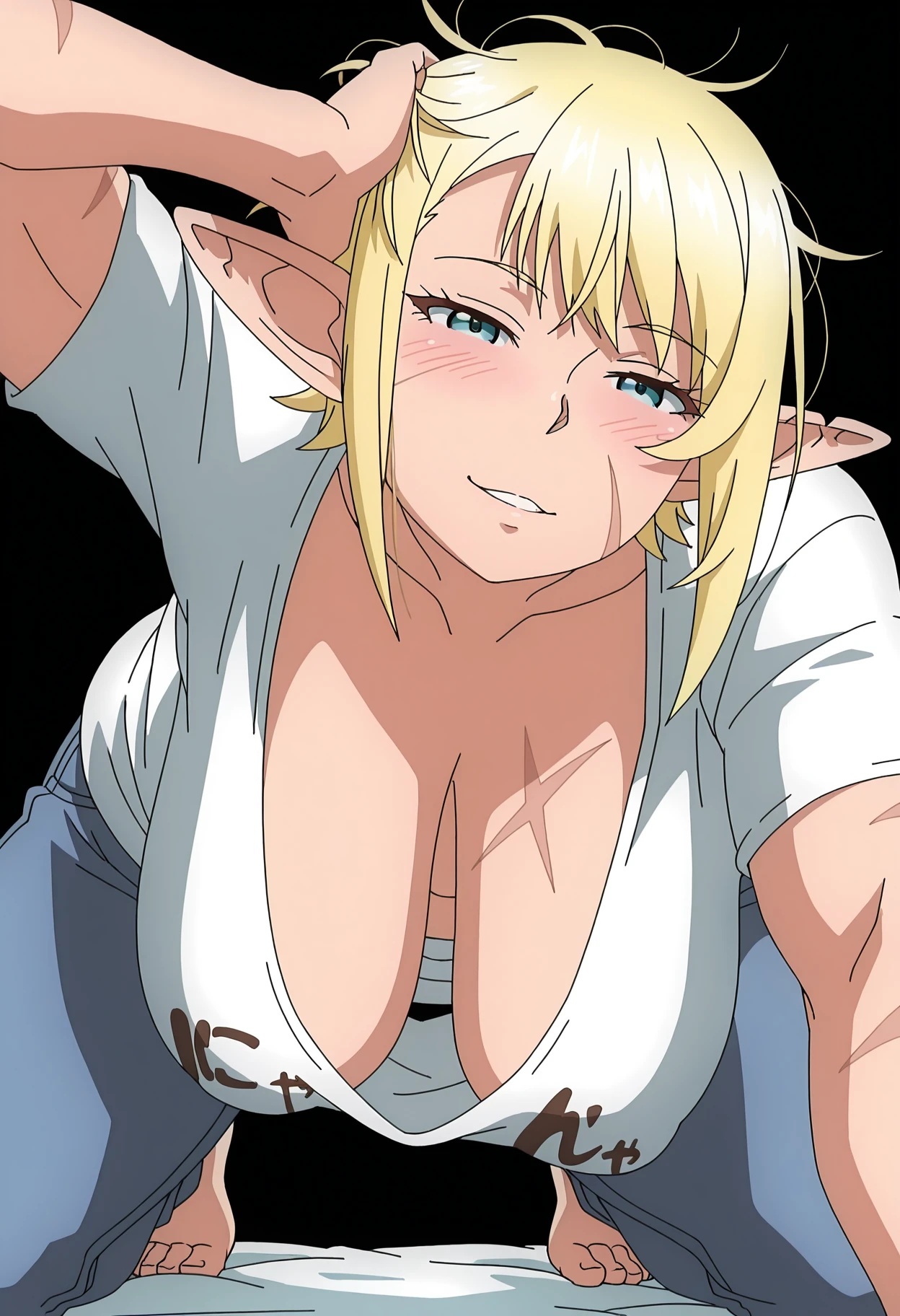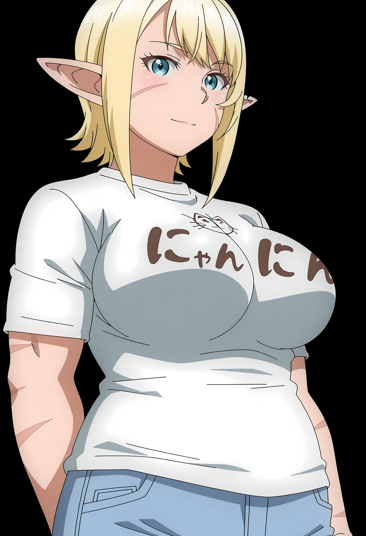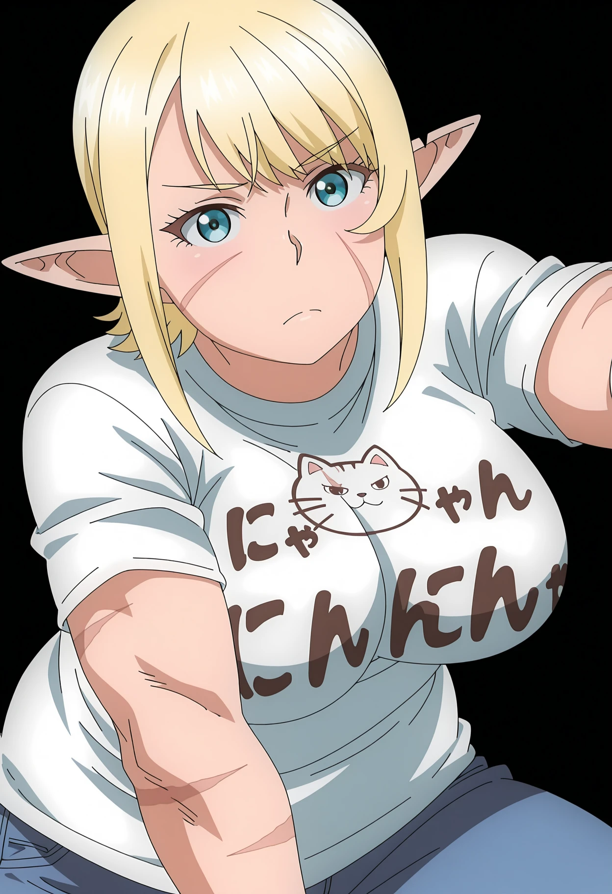 1girl, ooeda, elf, scar, scar on face, scar on cheek, scar across eye, scar on nose, pointy ears, muscular, short hair, blonde hair, bangs, blue eyes, large breasts