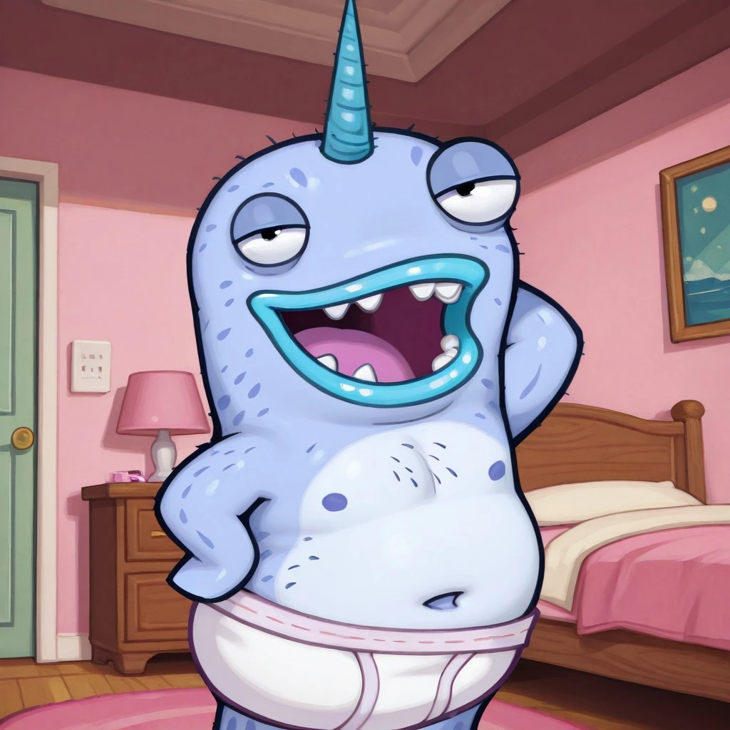 Tags: Narwhal, light blue skin, white belly, shaved, shaved fur, blue fins, no legs, fins, flippers, no hands, no fingers, blue ???????, navel, bright blue lips, big lips, 3 teeth, blue horn, horn on head, chubby, white underwear, underwear, single horn