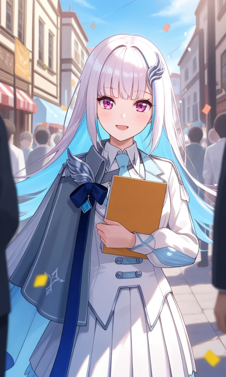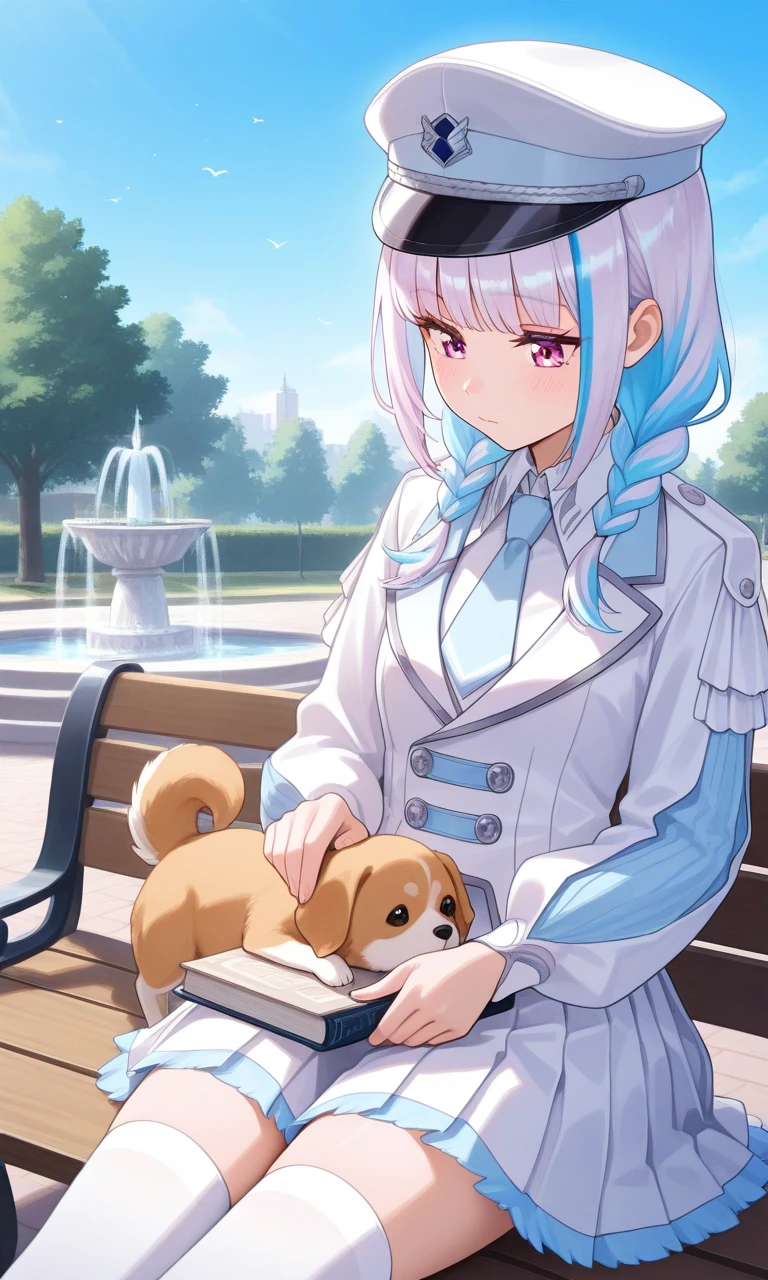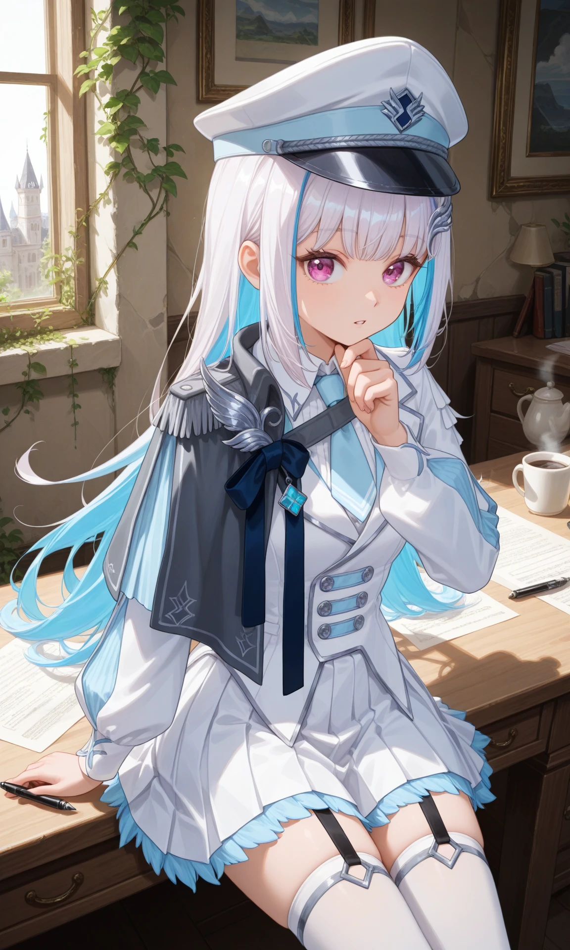 lize8th, long hair, peaked cap, white hat, side cape, white jacket, white shirt, collared shirt, light blue necktie, white skirt, pleated skirt, white thighhighs📋🖤Black version :