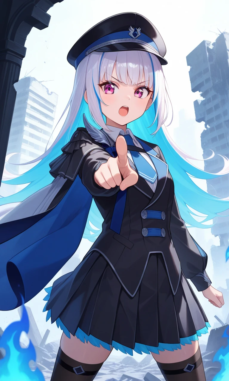 lize8th, long hair, peaked cap, black hat, side cape, black jacket, white shirt, collared shirt, blue necktie, black skirt, pleated skirt, black thighhighs