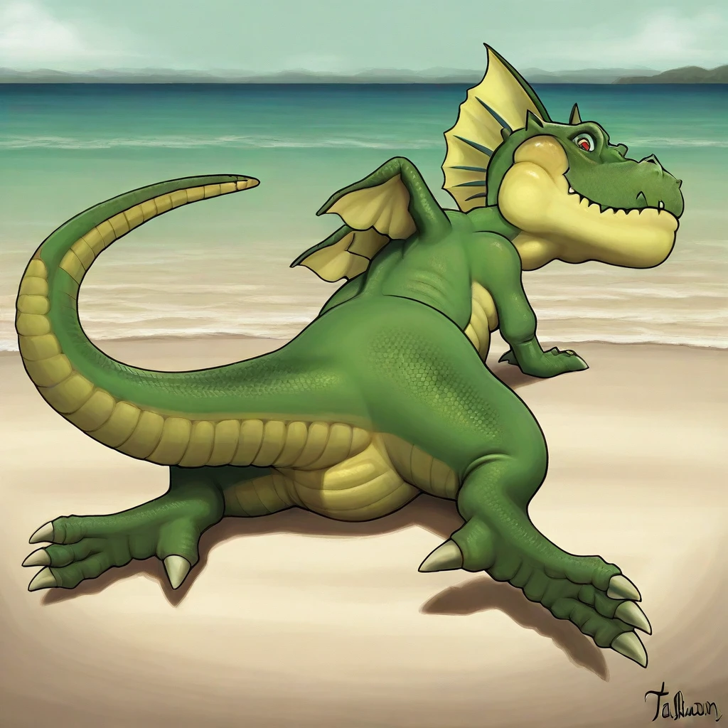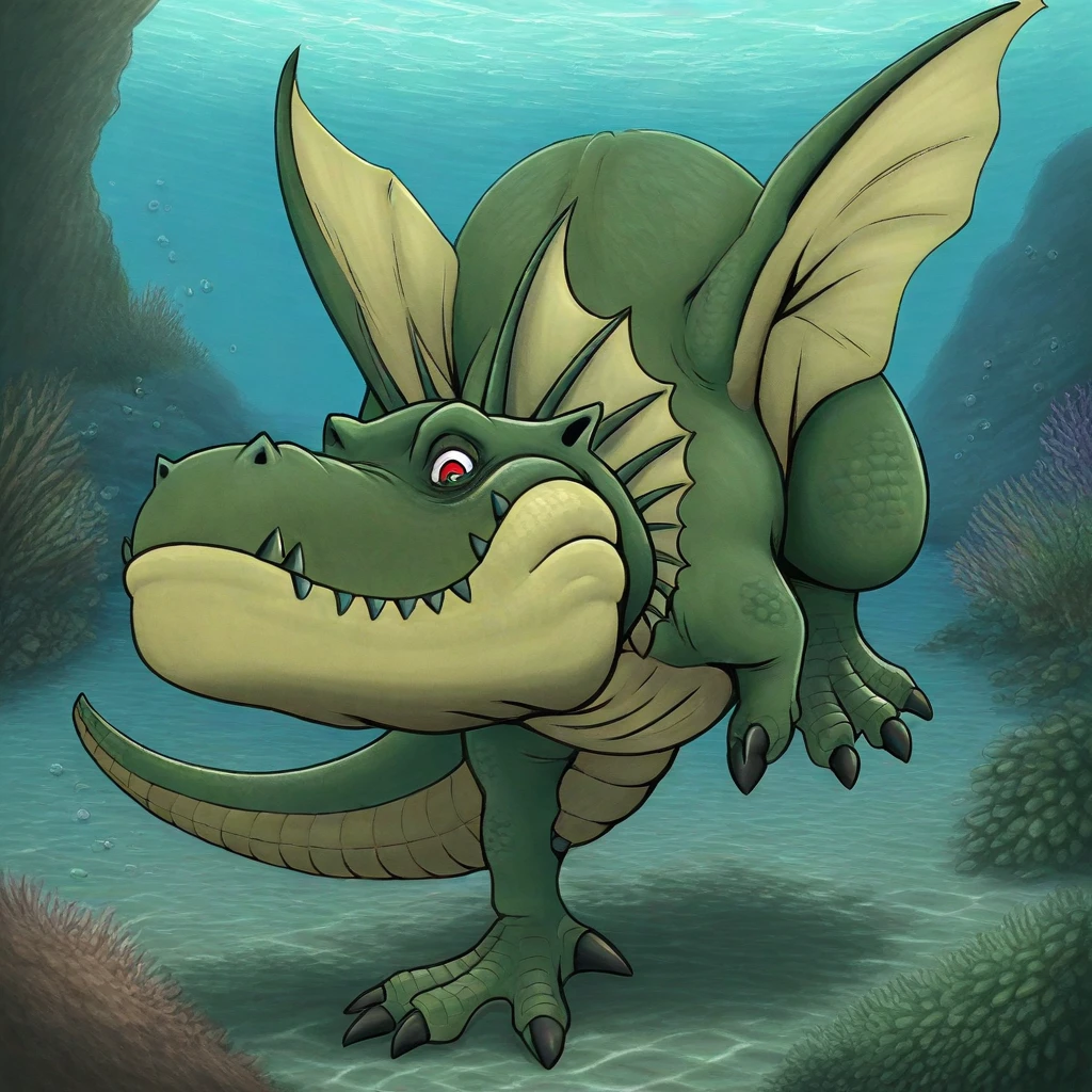 dinosaur, red eyes, small wings, fins, reptilian, green scales, long tail, claws, talons,